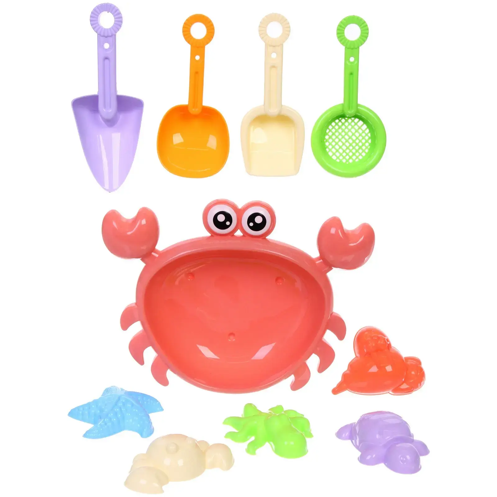 4 совка (лавандовый, оранжевый, кремовый, зелёный) + 6 фигурок: краб, звезда, улитка, черепаха и другие морские персонажи. Центральный элемент — розовый краб с выразительными глазами станет главным героем игр.