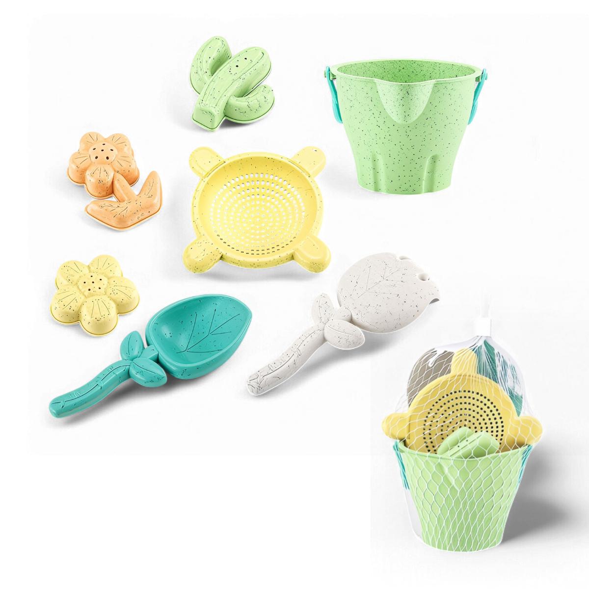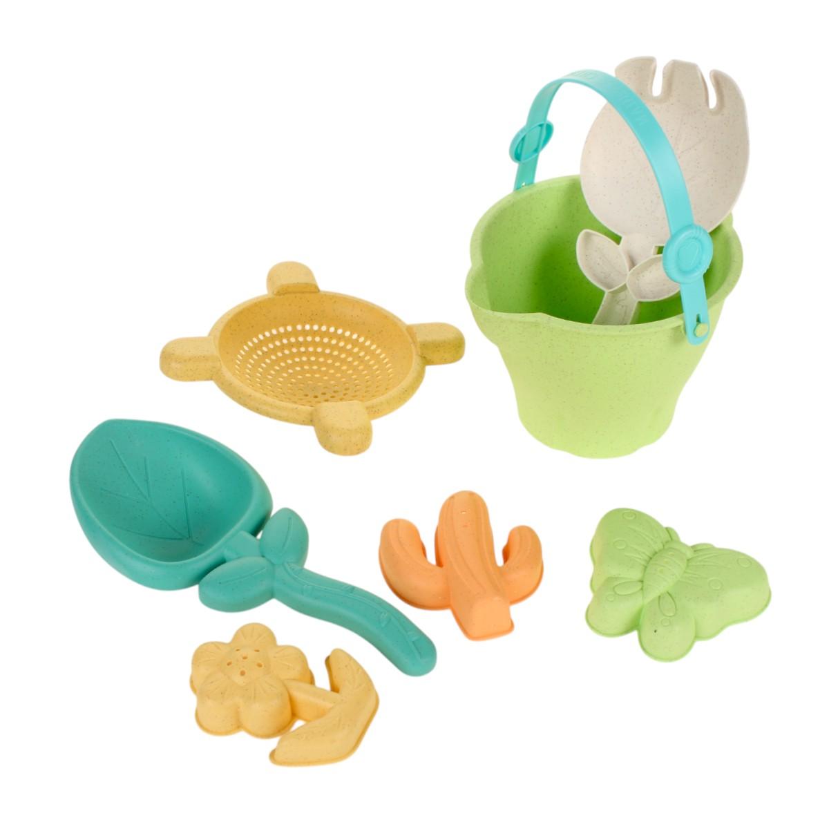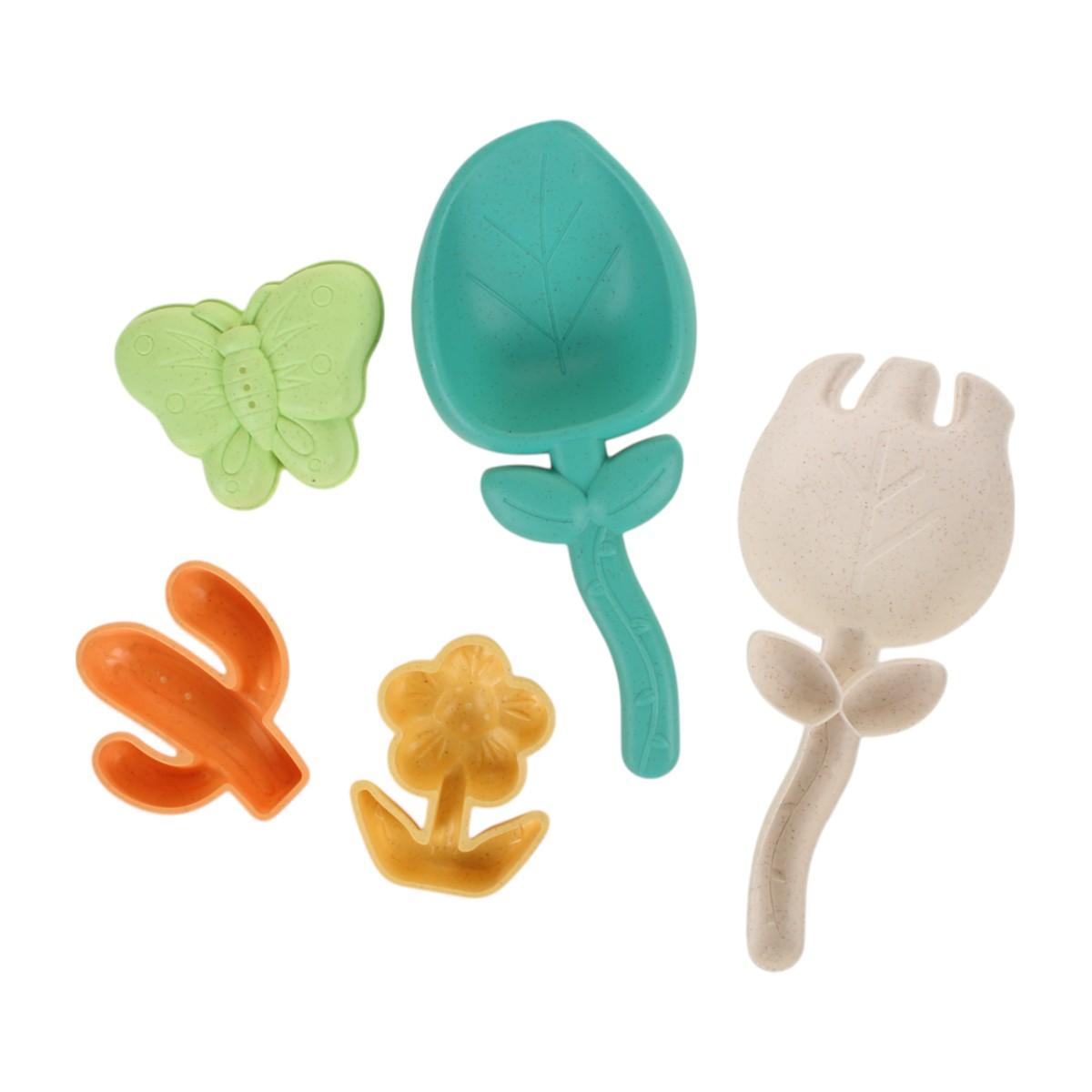 В набор входят: ведерко, лопатка, грабли, сито и три формочки в виде цветка, кактуса и бабочки. Все элементы имеют удобные размеры, что позволяет даже самым маленьким детям легко ими пользоваться. Набор подходит для детей от 3-х лет и может использоваться как с песком, так и с водой, а зимой — для игр со снегом.