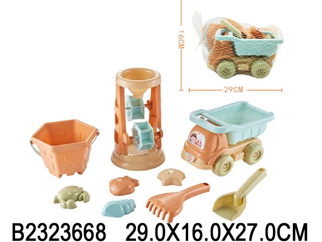 Набор для игры в песок 9 предметов: Самосвал, ведро, мельница, совок, грабли, 4 формочки, сетка 200-
