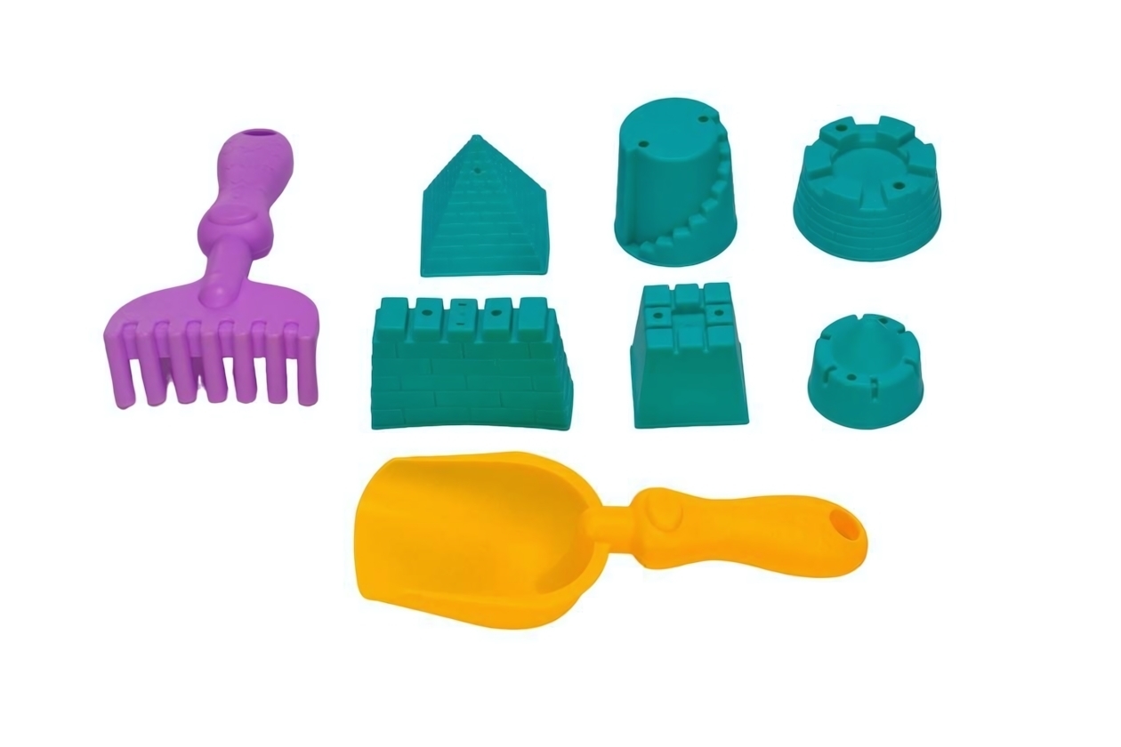 Набор для песочницы с 8 формочками, лопаткой и граблями, пластик, яркие цвета