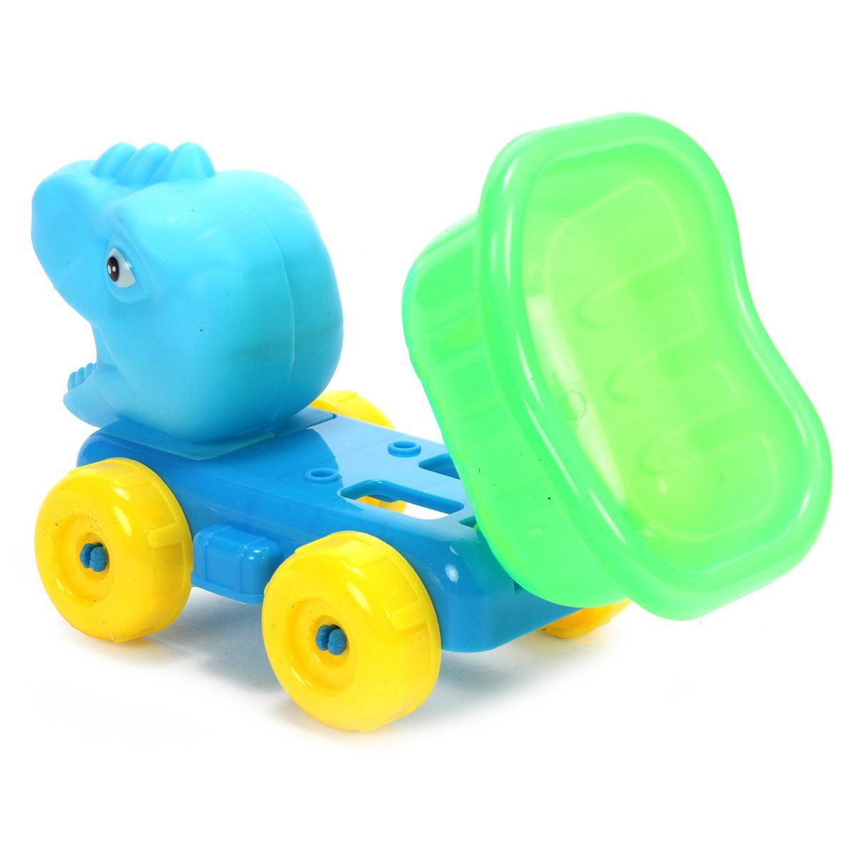 Машинка-динозавр не только украшает набор, но и служит функциональным элементом – в ее кузове можно перевозить песок и другие элементы набора.