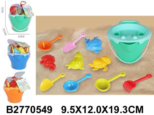 - Полный комплект для творчества: ведерко с дренажными отверстиями, 2 сита, 4 лопатки, грабли и 4 формочки с морскими животными