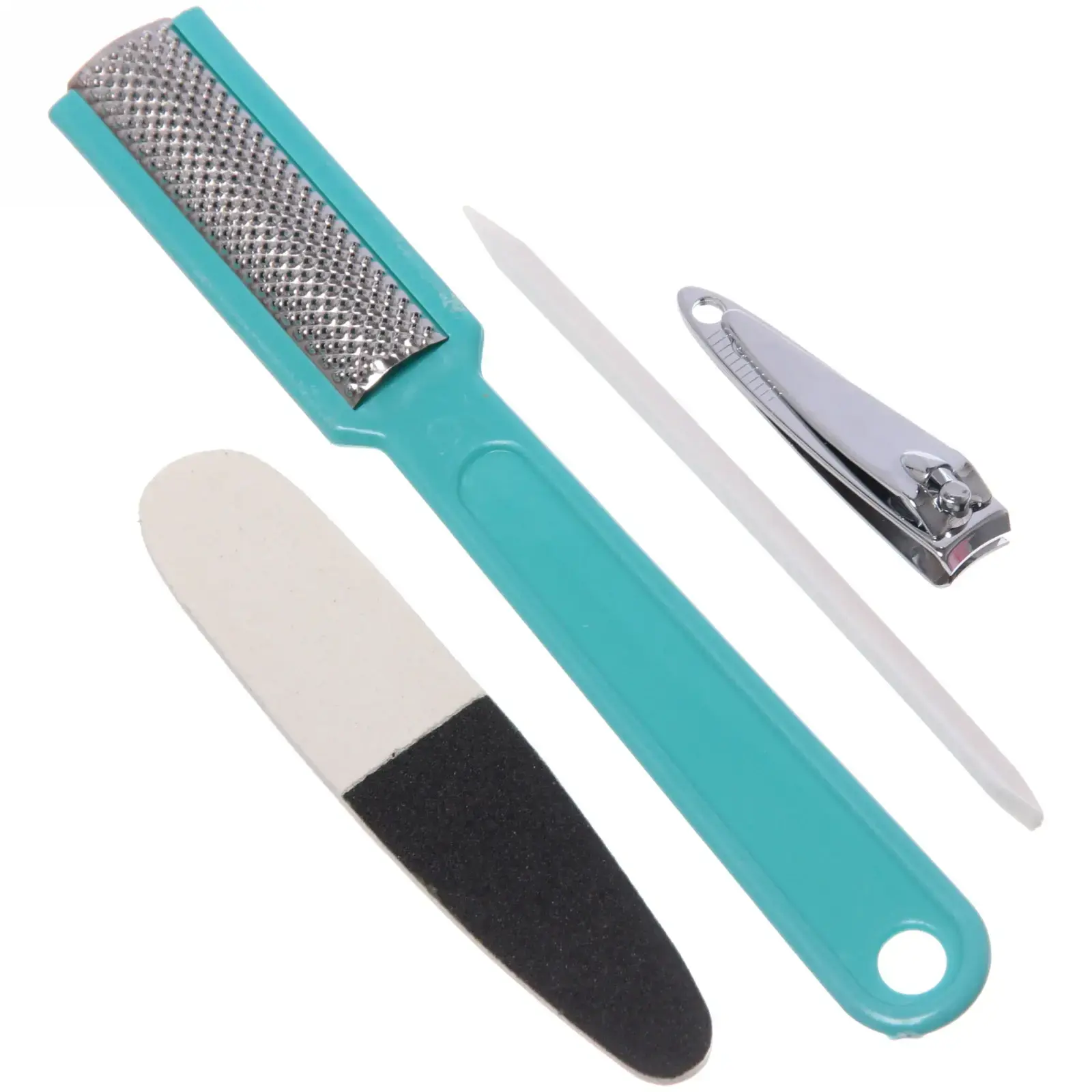 Размеры каждого инструмента идеально подходят для удобного использования. Цвет терки — голубой, с металлической рабочей поверхностью, а кусачки имеют хромированное покрытие. Пилка и палочка также выполнены в стильном дизайне, что делает набор не только функциональным, но и эстетически привлекательным.