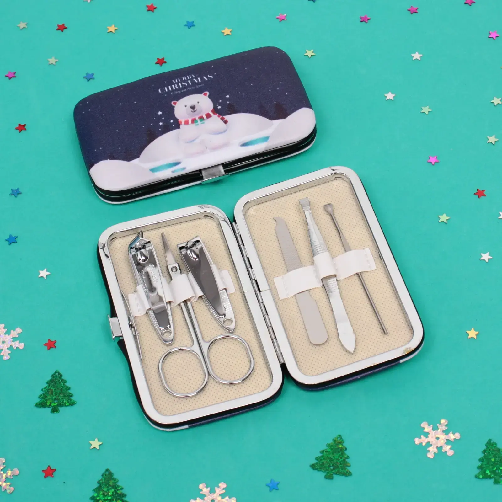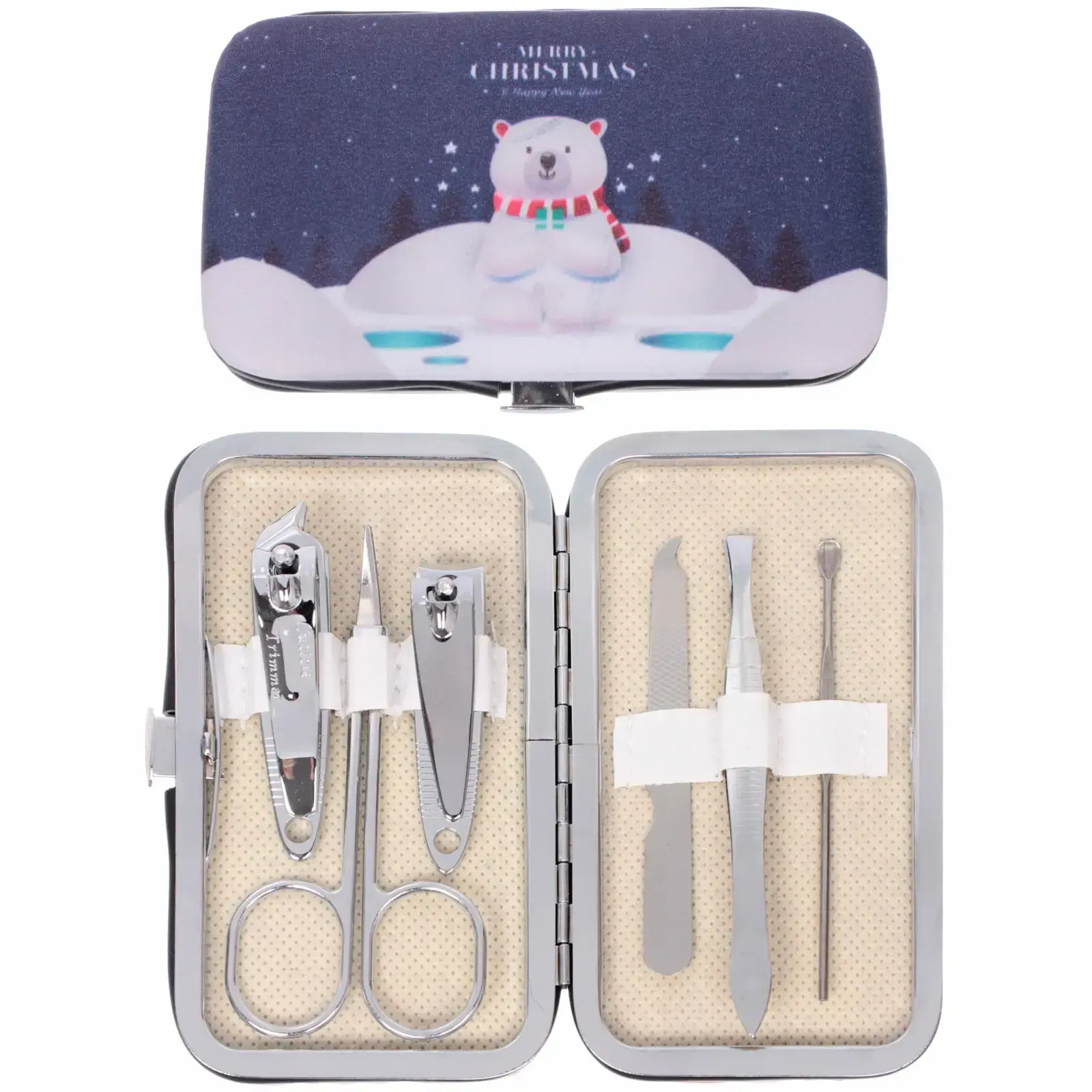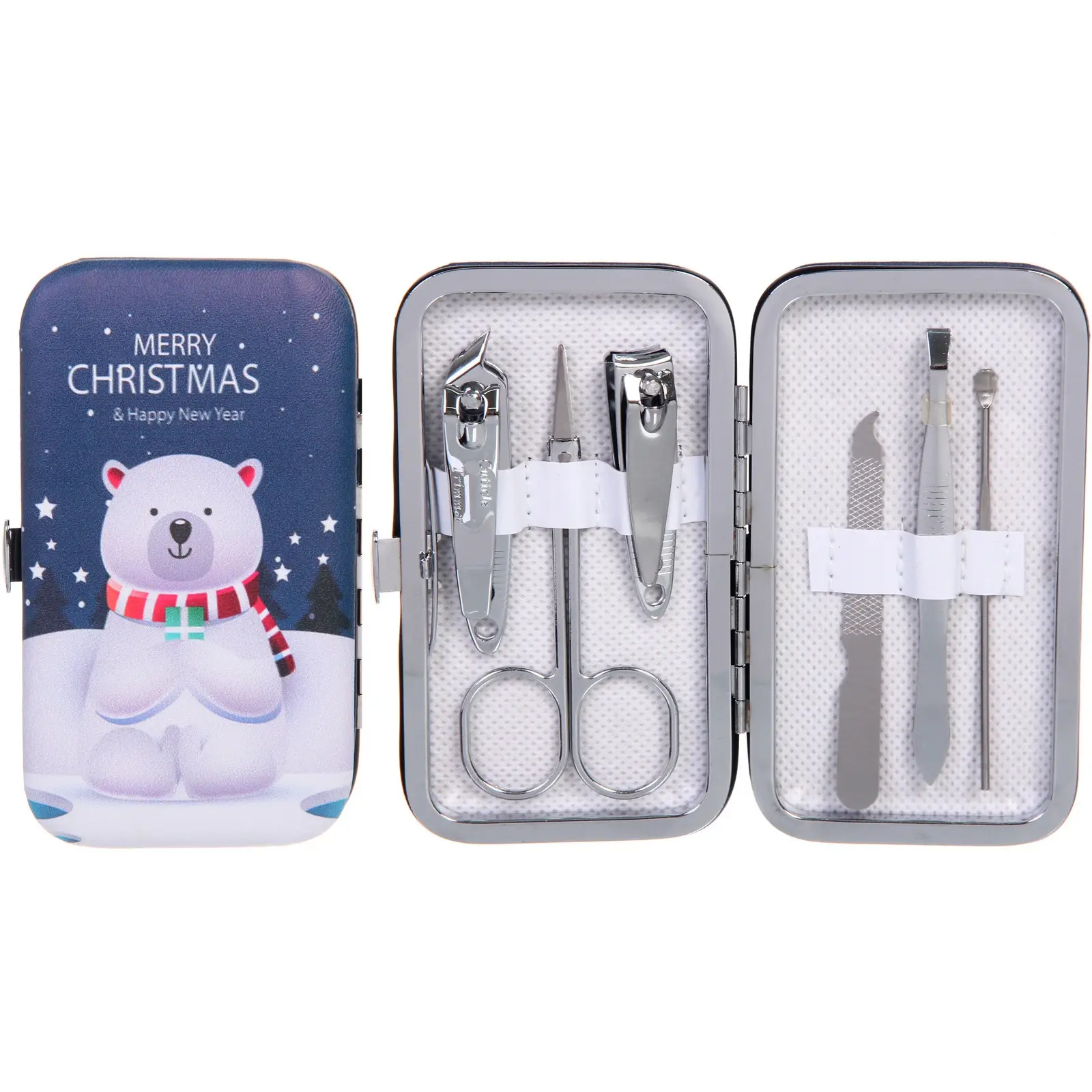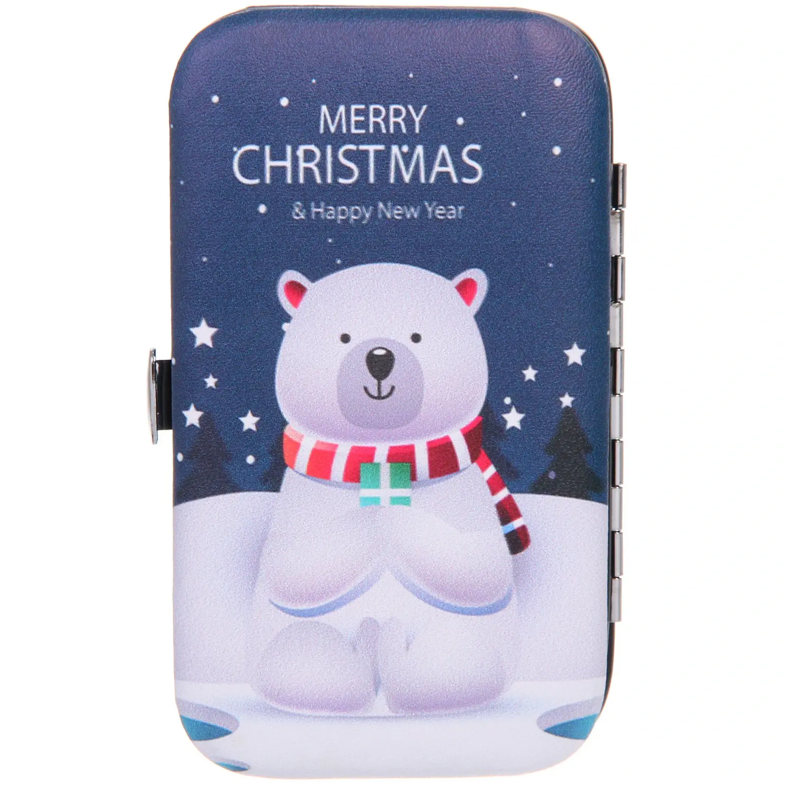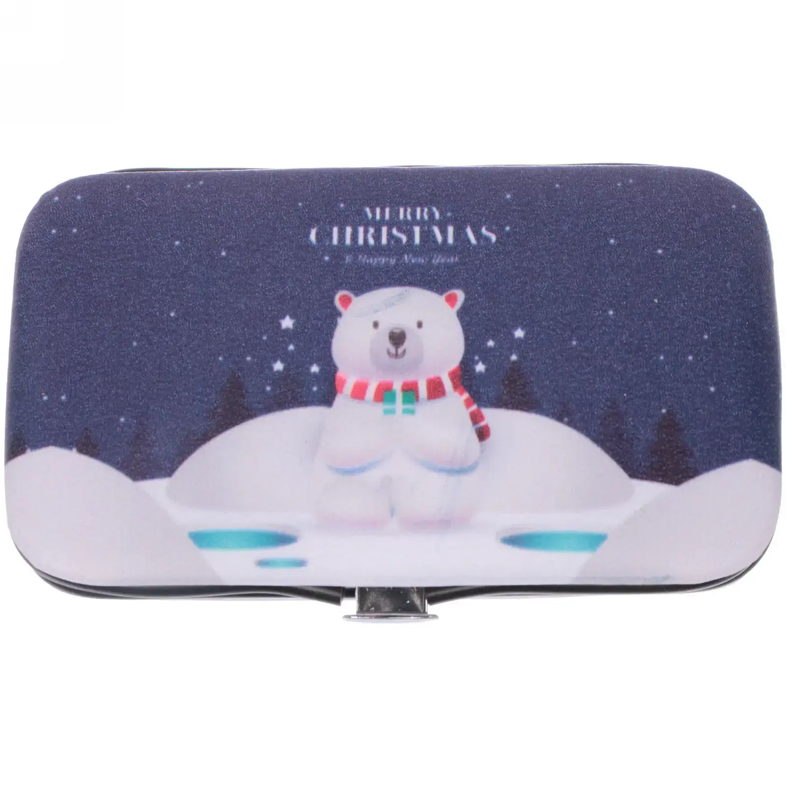 Все инструменты выполнены из прочного металла с блестящей поверхностью, что обеспечивает их долговечность и надежность. Футляр имеет стильный дизайн с изображением медведя на фоне зимнего пейзажа, что делает его отличным подарком на Новый год или Рождество.