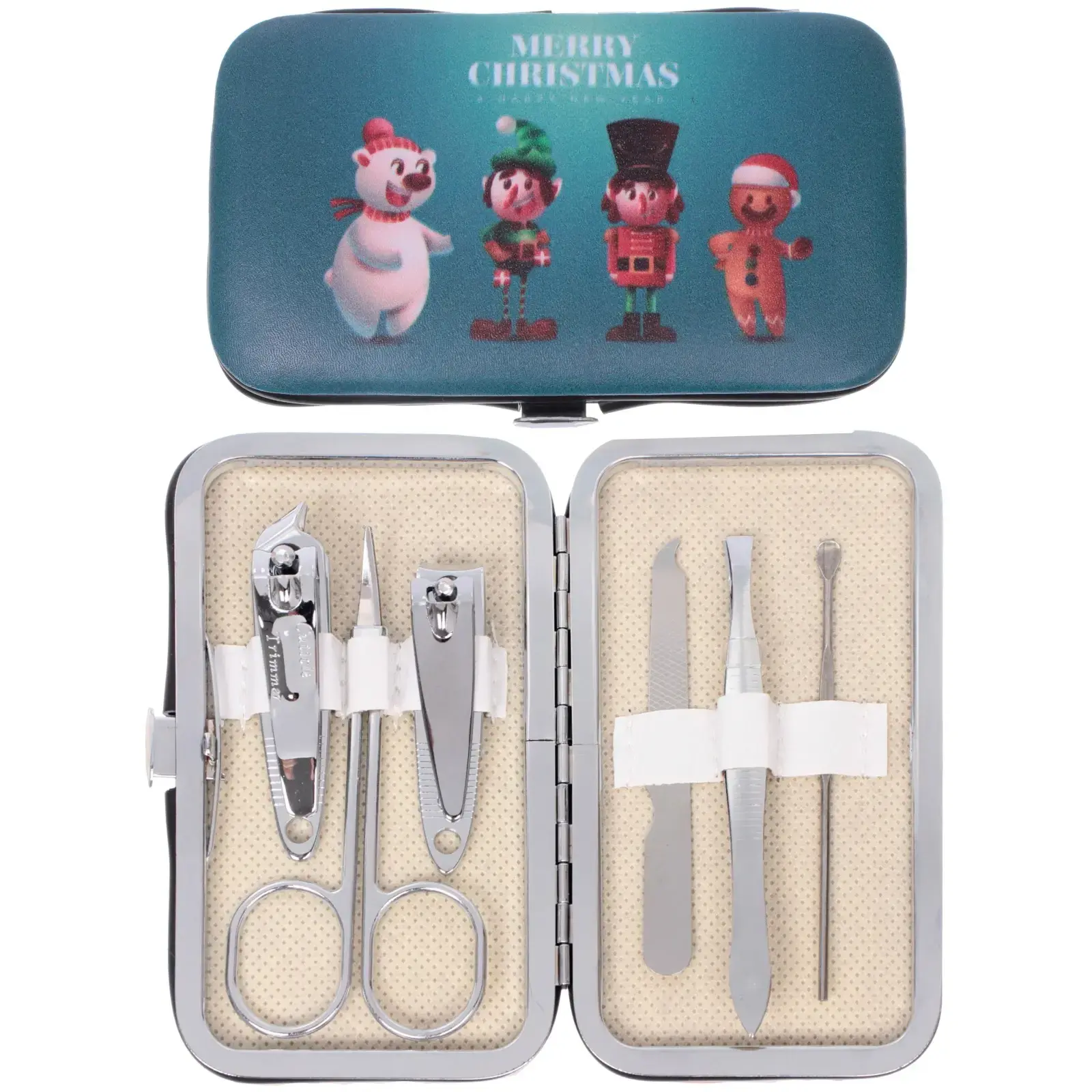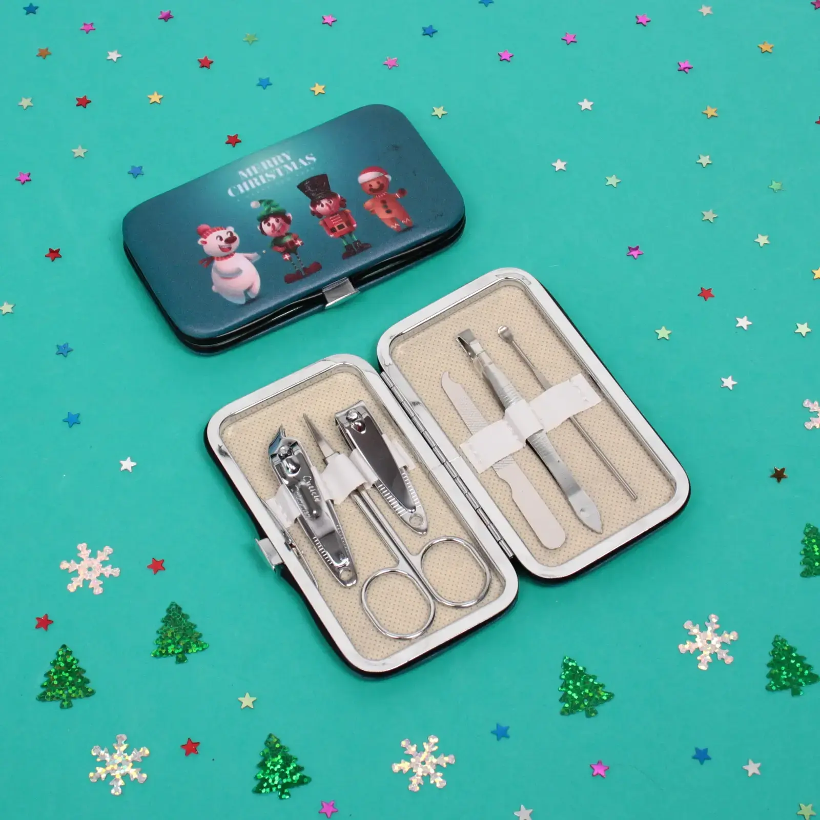 Идеальный комплект для создания безупречного маникюра с тематическим оформлением к зимним праздникам. Металлический футляр с иллюстрациями снеговика, пряничного человечка и надписью MERRY CHRISTMAS превращает обычный уход за ногтями в особенный ритуал.