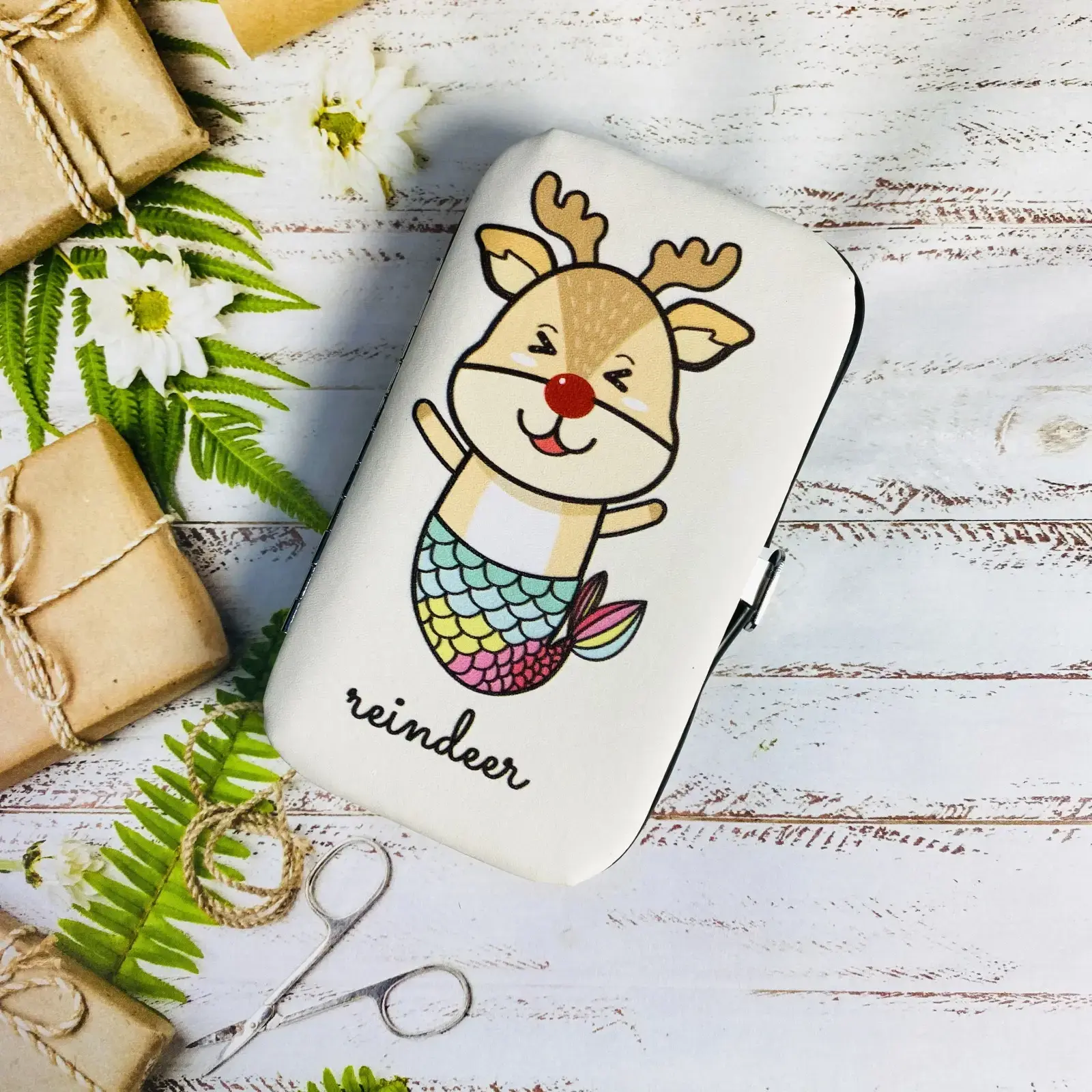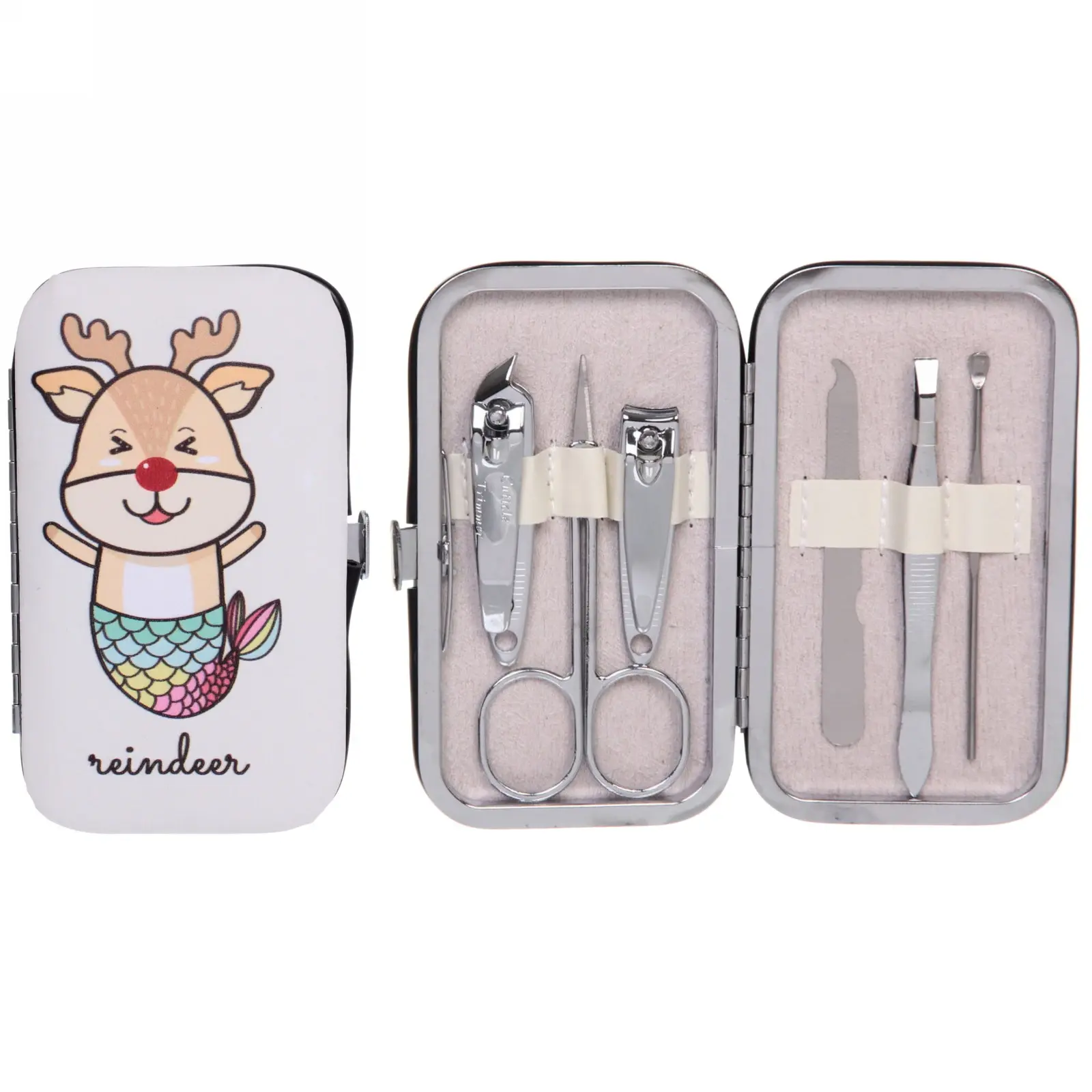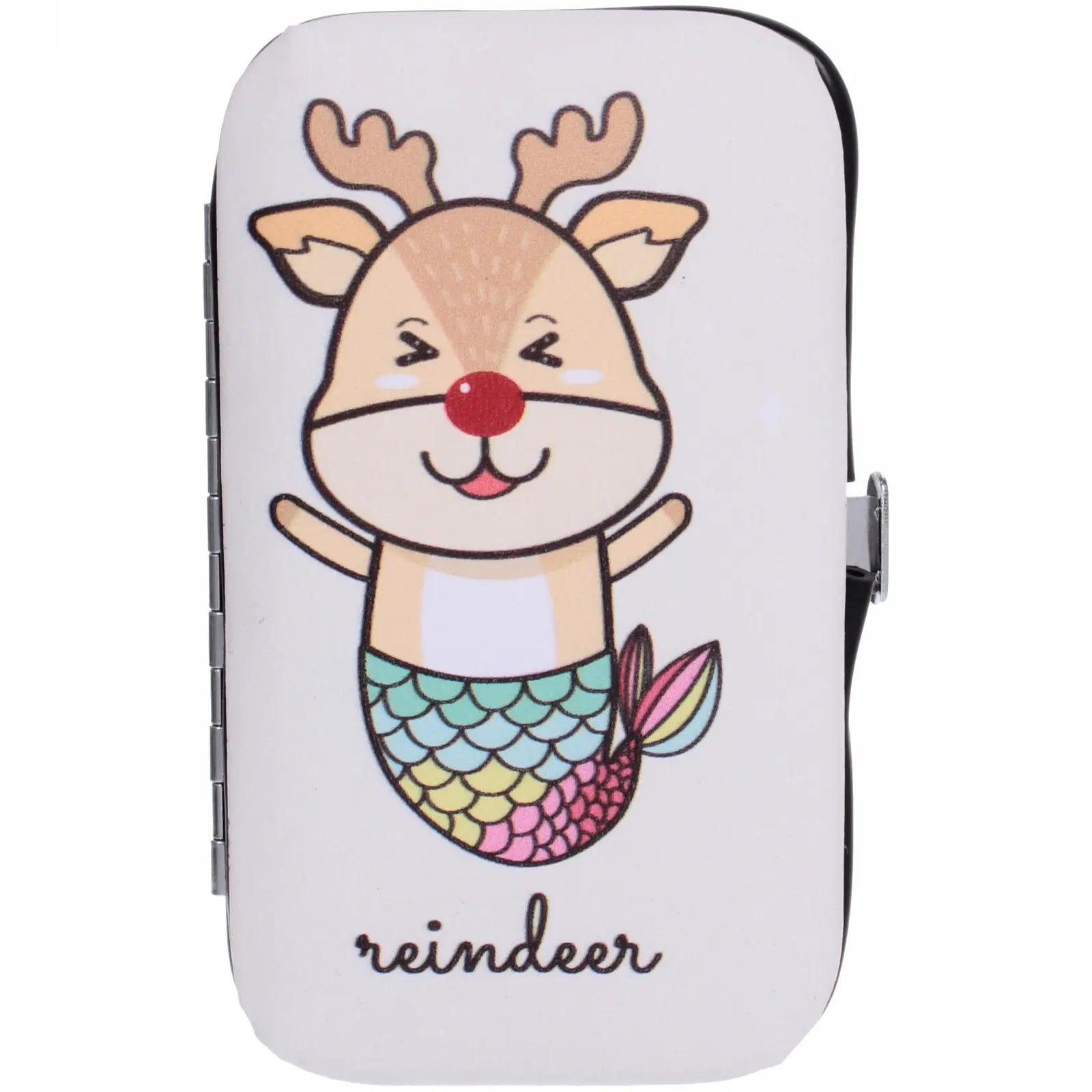 В набор входит 6 высококачественных металлических инструментов: ножницы, кусачки, нож для кутикулы, пилочка и другие. Все инструменты аккуратно размещены в прочном футляре с декоративным изображением мультяшного оленя с рогами, придающим продукту милый и привлекательный вид. Используйте этот набор как для ежедневного ухода, так и для более аккуратного и точного моделирования ногтей дома или в поездках.