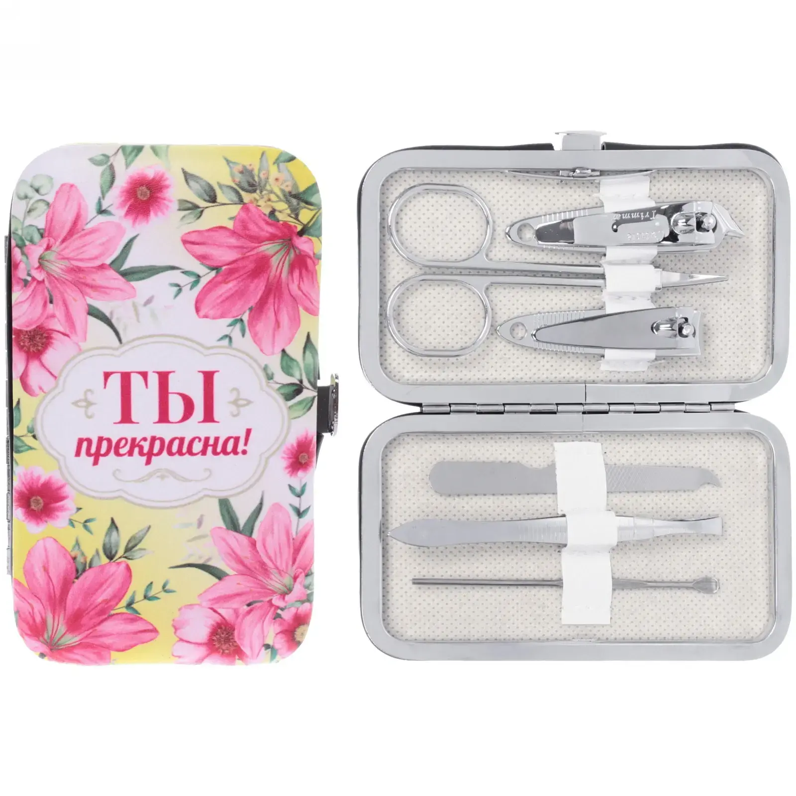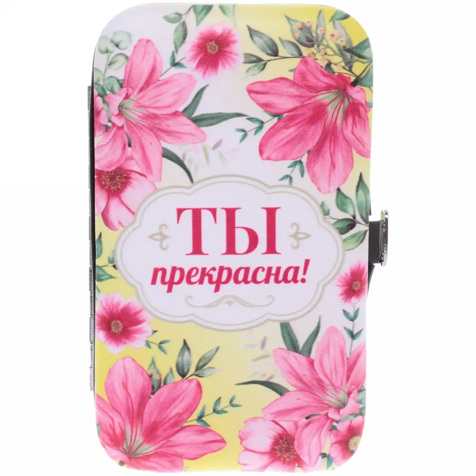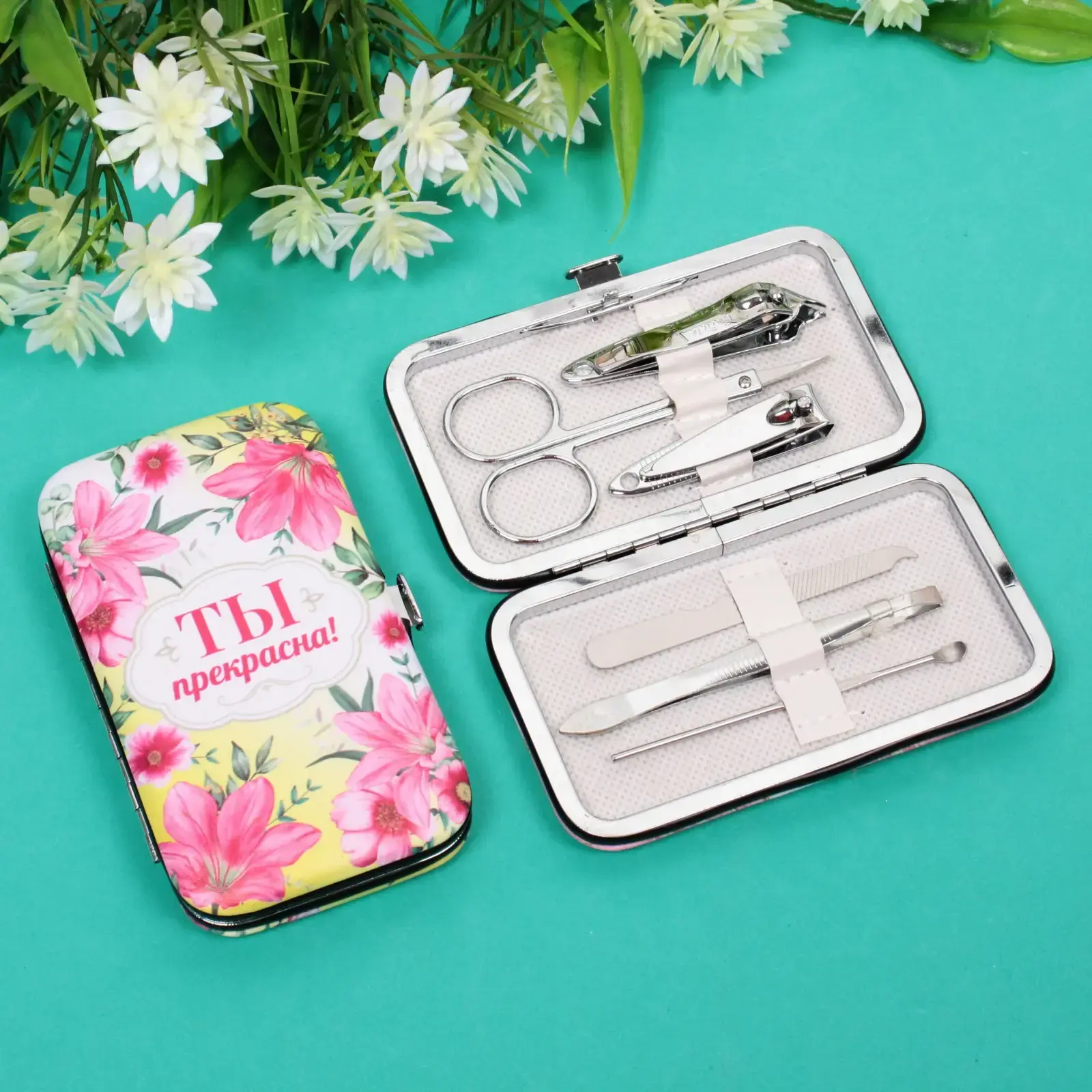 Подарите себе и своим близким заботу о ногтях с набором для маникюра «Ты прекрасна!». Этот стильный и компактный набор включает в себя все необходимые инструменты для ухода за ногтями, что делает его идеальным выбором для домашнего использования и путешествий. Яркий дизайн футляра с цветочным узором и надписью «Ты прекрасна!» добавляет нотку радости и вдохновения в каждую процедуру.