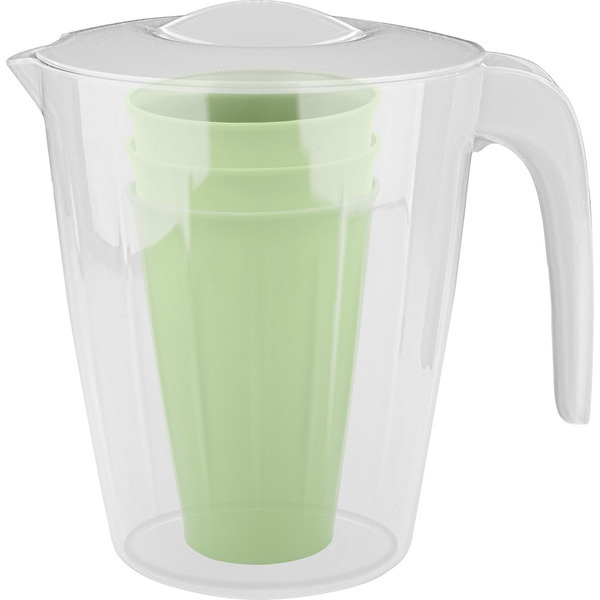 Кувшин оснащен крышкой, которая защищает содержимое от насекомых и пыли, что особенно важно при использовании на улице. Удобная ручка позволяет легко наливать напитки, даже когда кувшин полностью заполнен. Стаканы имеют аналогичную форму и размер, что позволяет удобно укладывать их друг в друга для хранения.