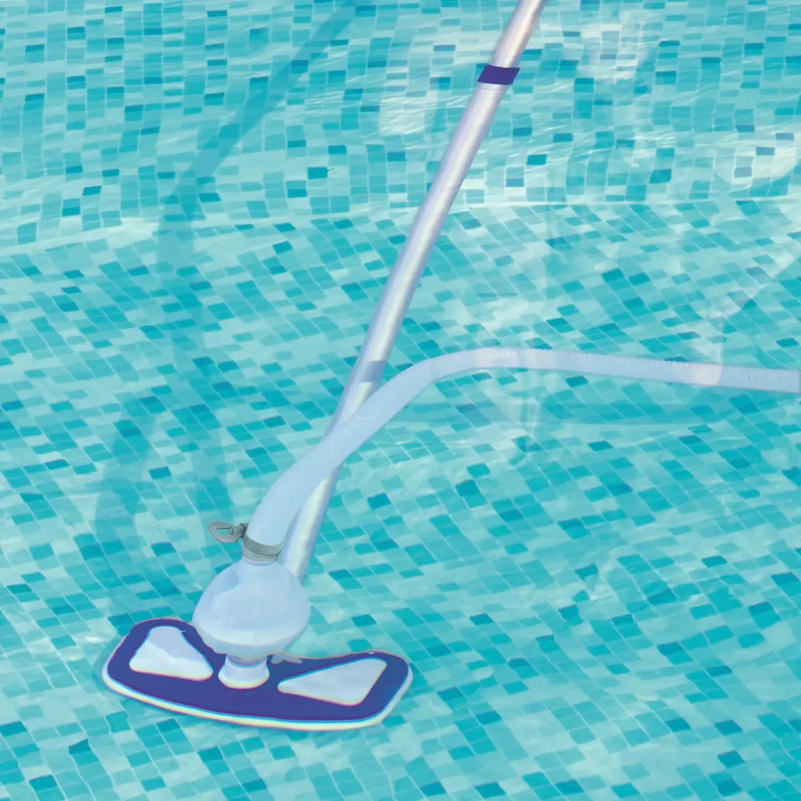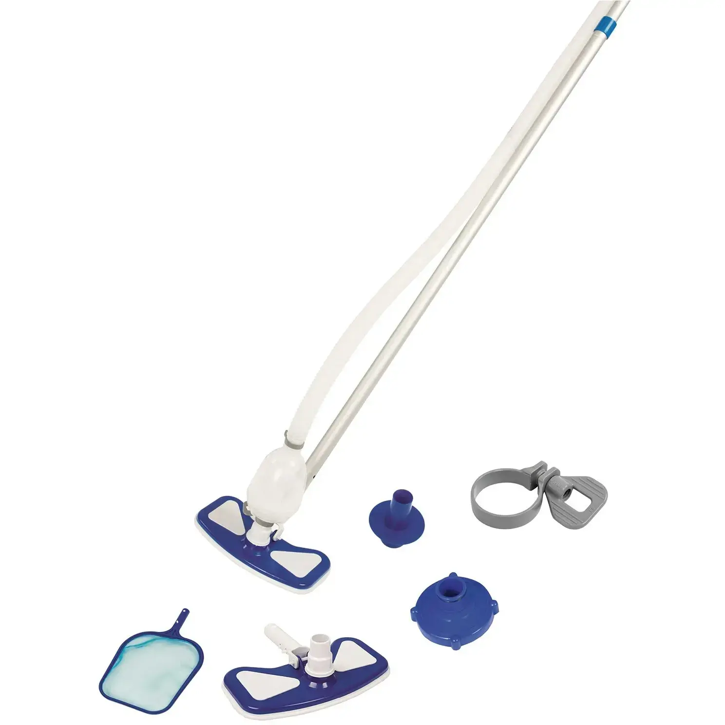 В комплект входят: регулируемая телескопическая штанга длиной 279 см, сачок для сбора мусора, ручной пылесос и несколько переходников для подключения к фильтрующей системе. Это делает набор универсальным и подходящим для различных типов бассейнов. Сборка набора не займет много времени, и вы сможете сразу приступить к уборке.