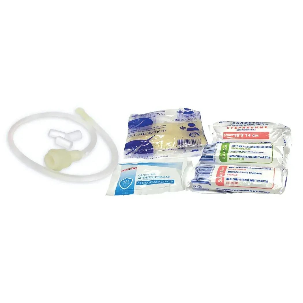 Рекомендовано хранить в сухом месте при температуре от -20°C до +40°C. Комплектация соответствует требованиям ГОСТ Р 58398-2019 для средств первой помощи.