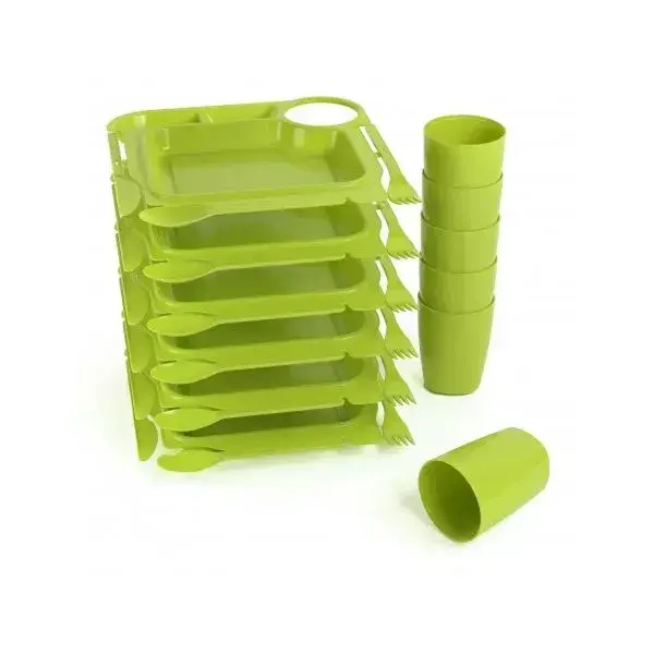 Набор изготовлен из экологичного пластика, разрешённого для контакта с пищевыми продуктами. Все элементы выполнены в едином стиле и цветовой гамме (майская зелень), что особенно оценят любители эстетичных решений для пикника. Компактные размеры сложенного комплекта позволяют легко транспортировать его в сумке или рюкзаке.