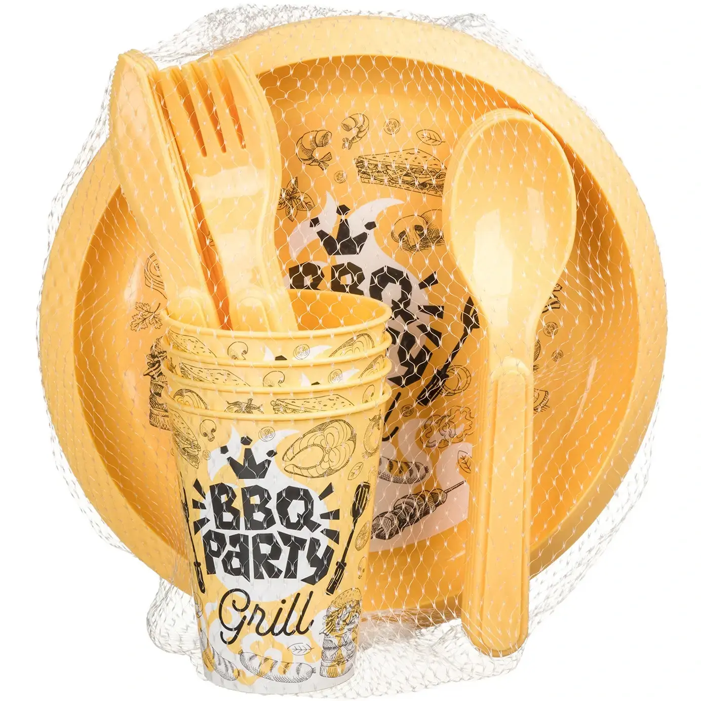 Набор поставляется в практичной прозрачной сетке, что делает его хранение и переноску еще удобнее. Идеально подходит для семейных выездов на природу, пикников и барбекю.