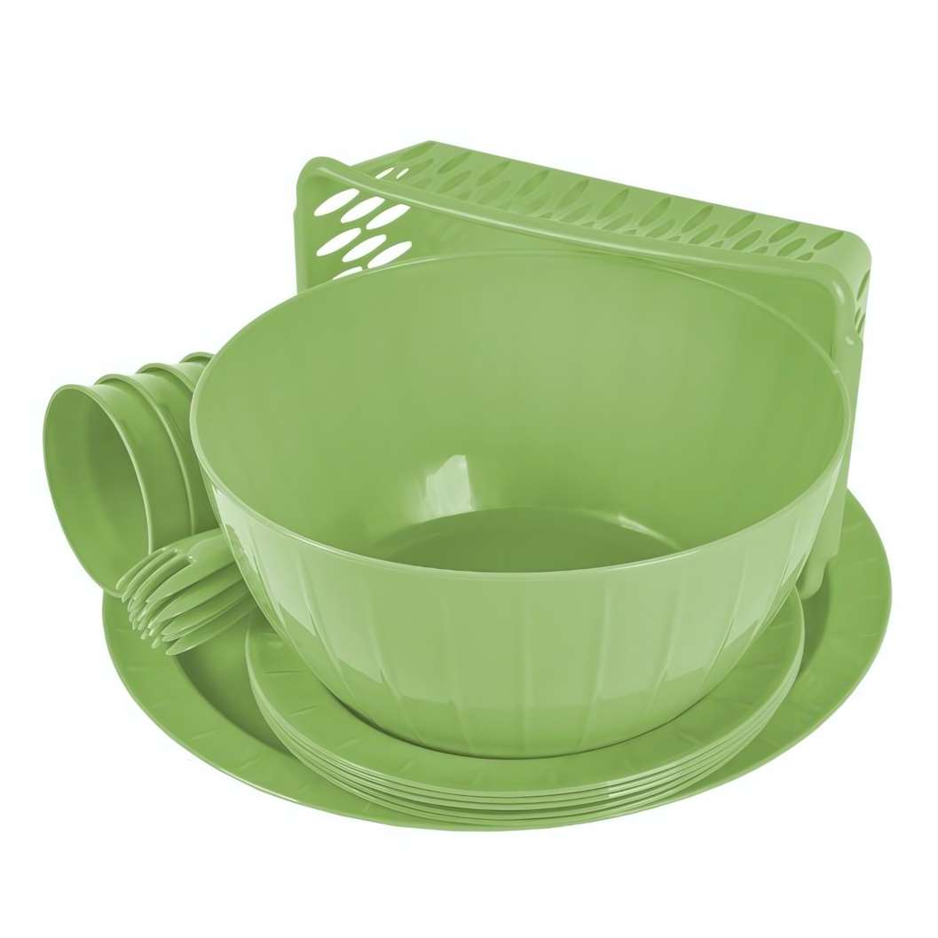 В набор входят 18 предметов: вместительный салатник объемом 2,8 л, 5 порционных тарелок, 5 стаканов, 5 вилок, корзинка и менажница. Такой состав позволяет сервировать стол для семьи или компании друзей без поиска дополнительной посуды. Все элементы выполнены в едином фисташковом цвете, что придает сервировке аккуратный и гармоничный вид.
