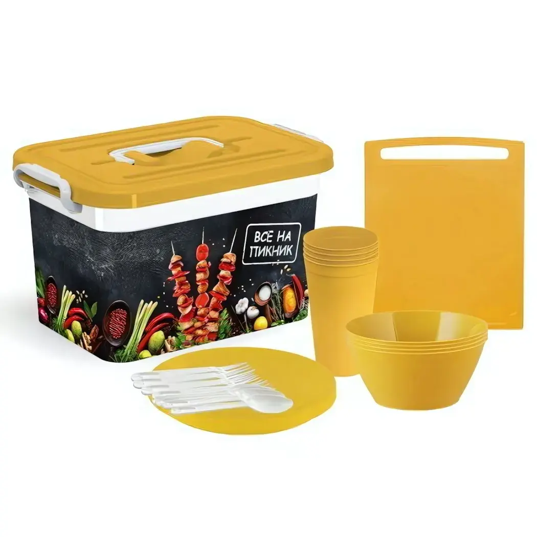 В набор входят: 6 желтых стаканчиков, 6 тарелок, 2 глубокие миски и 6 одноразовых вилок. Все элементы выполнены из качественного пластика, что гарантирует их надежность и безопасность. Контейнер имеет желтую крышку и белые элементы, что делает его стильным и современным. Размеры контейнера и предметов идеально подходят для комфортного использования на пикнике.