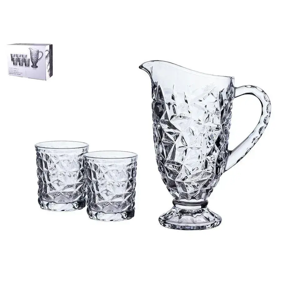 Набор включает кувшин объёмом 1000 мл с удобной изогнутой ручкой и два стакана по 320 мл. Скошенные стенки посуды создают оптическую иллюзию игры света, а текстурированная поверхность обеспечивает уверенный хват.