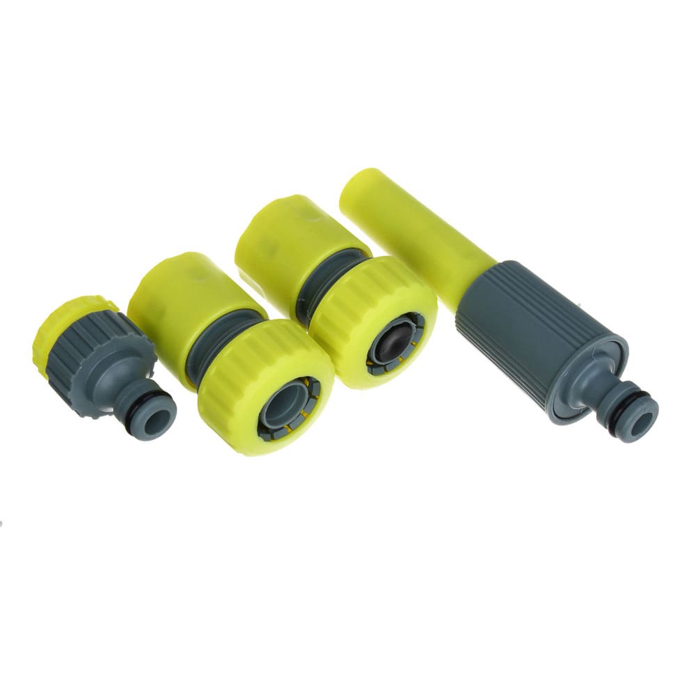 Шланг выполнен из ПВХ зеленого цвета, аксессуары сочетают серый и желто-зеленый оттенки. Диаметр шланга 1/2 дюйма обеспечивает достаточный напор воды для орошения. Упаковка компактна и удобна для хранения и транспортировки.