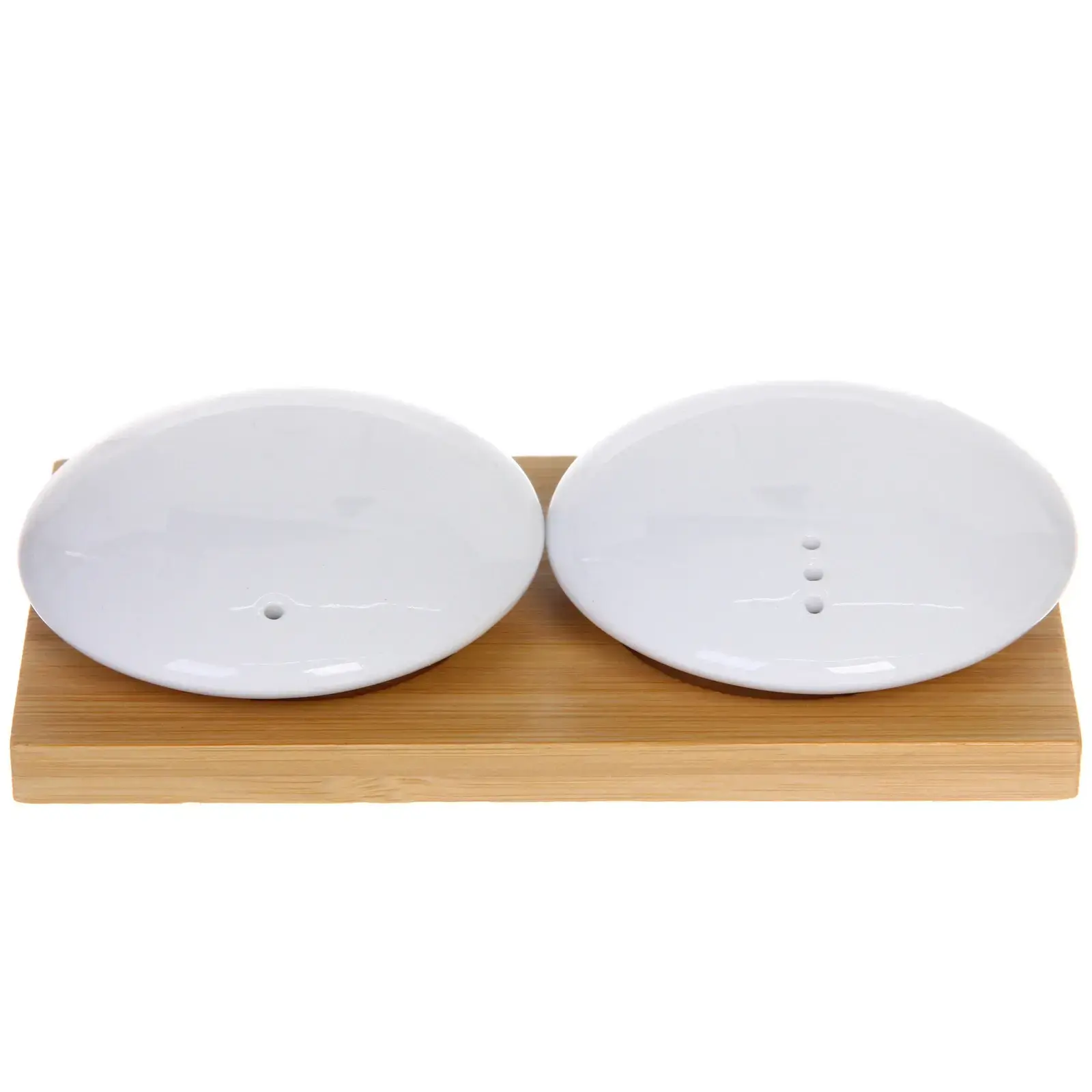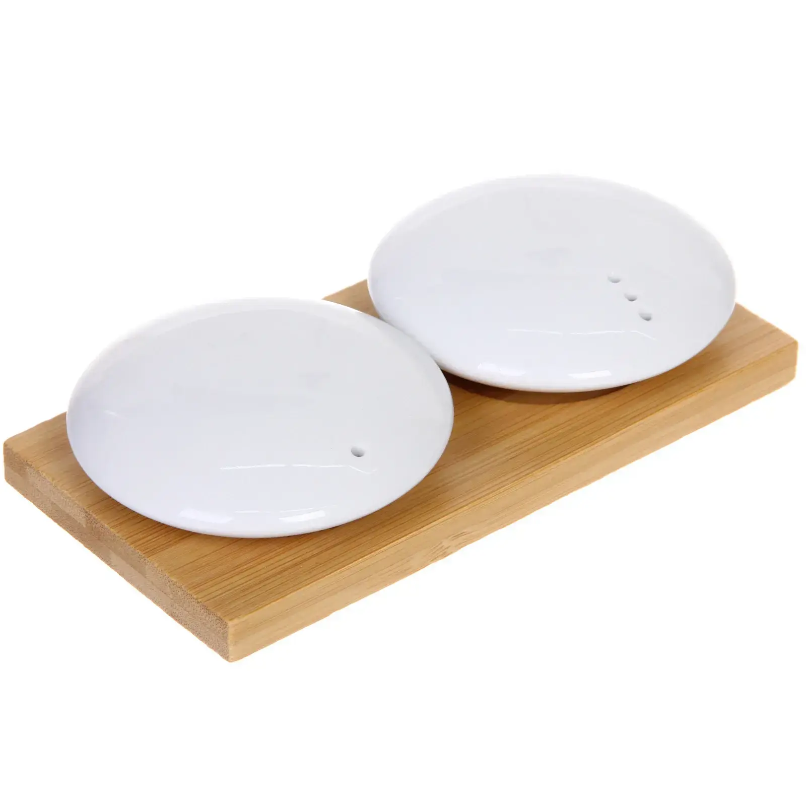 В комплект входят две плоские керамические емкости разных форм на деревянной подставке из натурального бамбука. Комбинация белоснежной керамики и теплого бамбука создает гармоничный дизайн, который впишется в любой интерьер.
