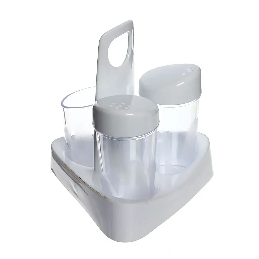 Набор состоит из трех контейнеров, которые удобно размещаются на белой подставке с ручкой для переноски. Два контейнера имеют прозрачные стенки, что позволяет легко видеть содержимое, а один — с отверстиями для удобного дозирования. Это делает использование набора простым и интуитивно понятным, идеально подходящим для повседневного приготовления пищи.