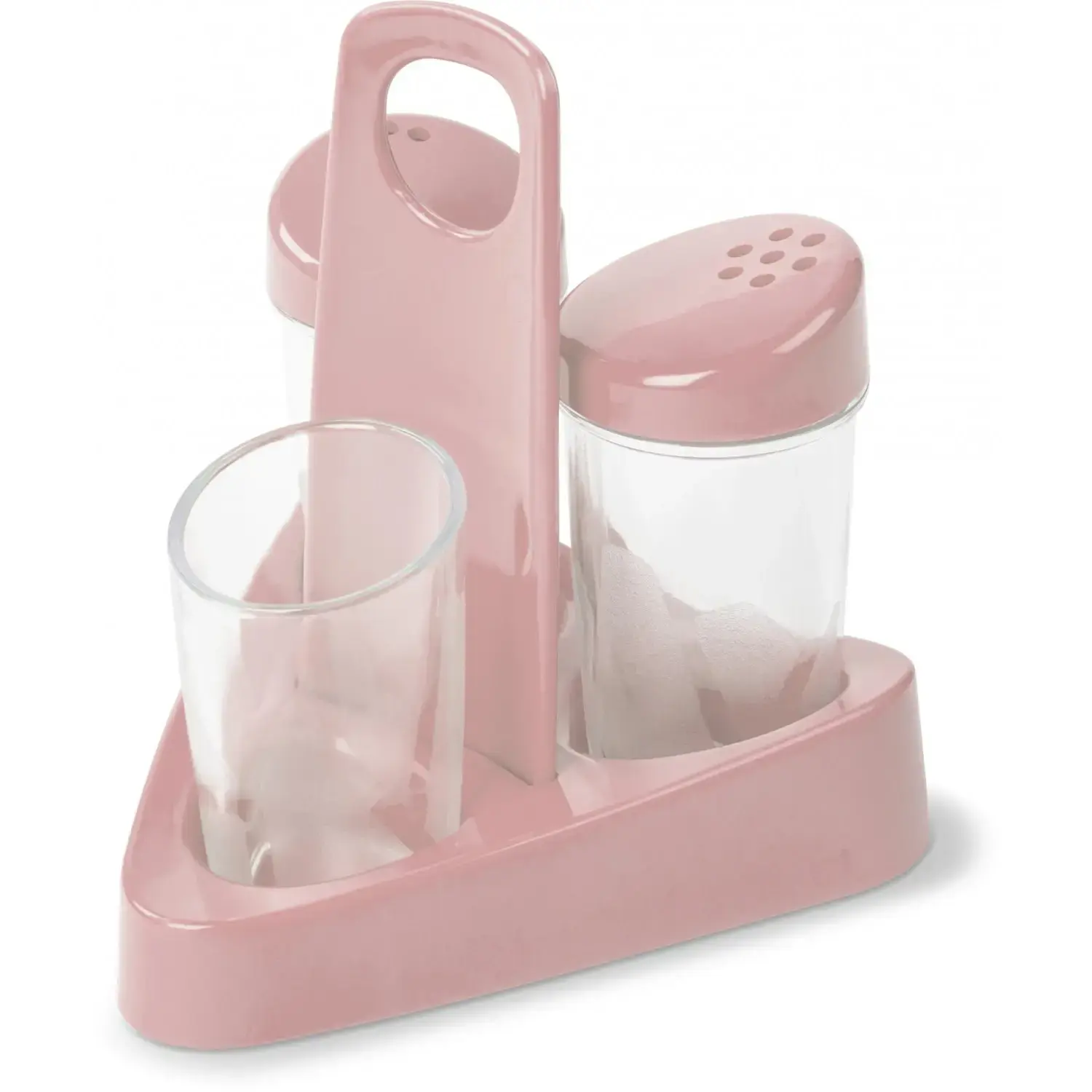 В комплект входят три емкости: солонка, перечница и стаканчик для зубочисток. Все элементы удобно размещаются на треугольной подставке с ручкой, что позволяет легко переносить набор с места на место. Прозрачные стенки контейнеров позволяют видеть содержимое, а крышки с отверстиями обеспечивают удобство при использовании. Набор идеально подходит для сервировки стола и станет отличным помощником в приготовлении блюд.