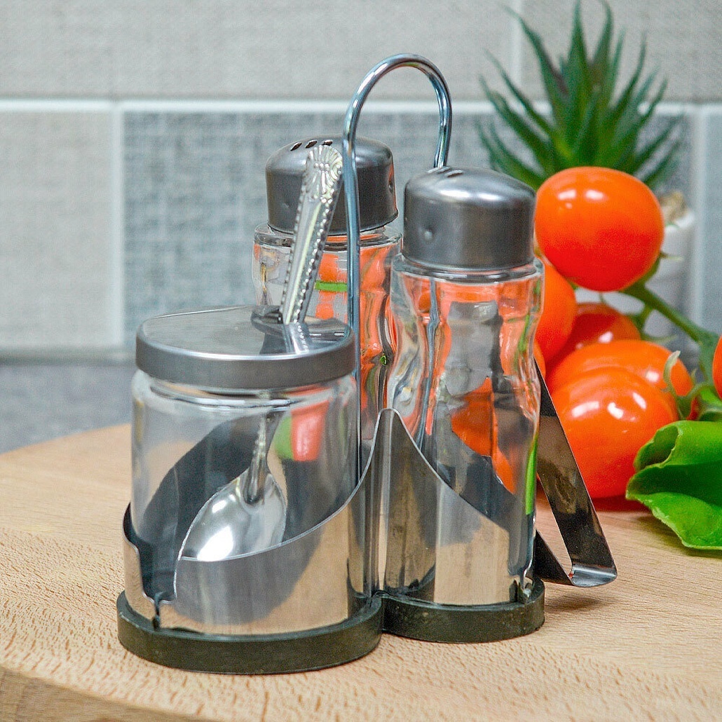Набор состоит из четырех предметов, включая три стеклянные емкости для приправ и салфетницу. Каждая емкость имеет металлическую крышку с отверстиями для удобного высыпания приправ, а одна из емкостей дополнена ложкой для легкого доступа к содержимому. Прозрачные стенки емкостей позволяют видеть содержимое, что упрощает выбор нужной приправы.