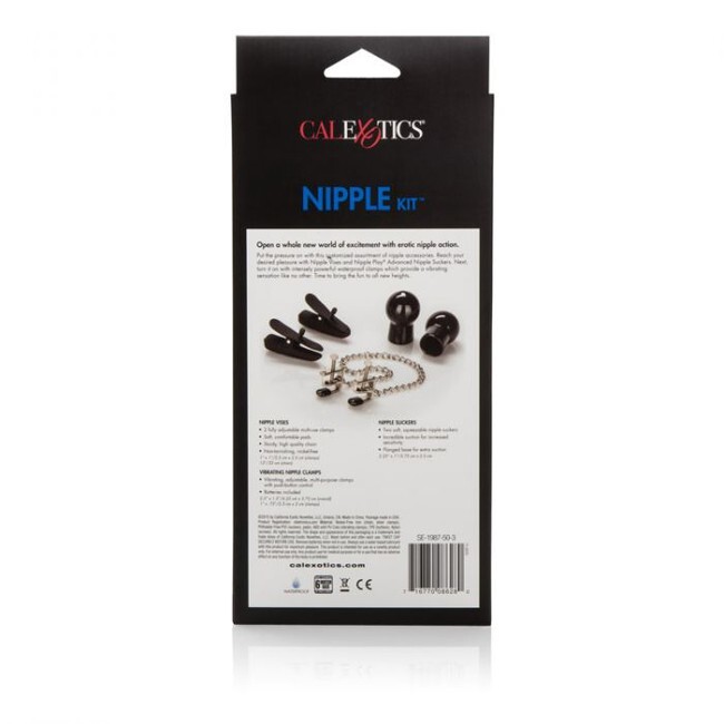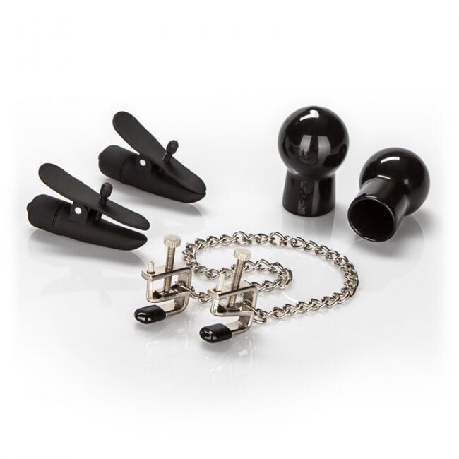 Набор для стимуляции сосков His Nipple Kit, 3 в 1: зажимы с цепью, вибро, вакуумные присоски, черный с серебряным