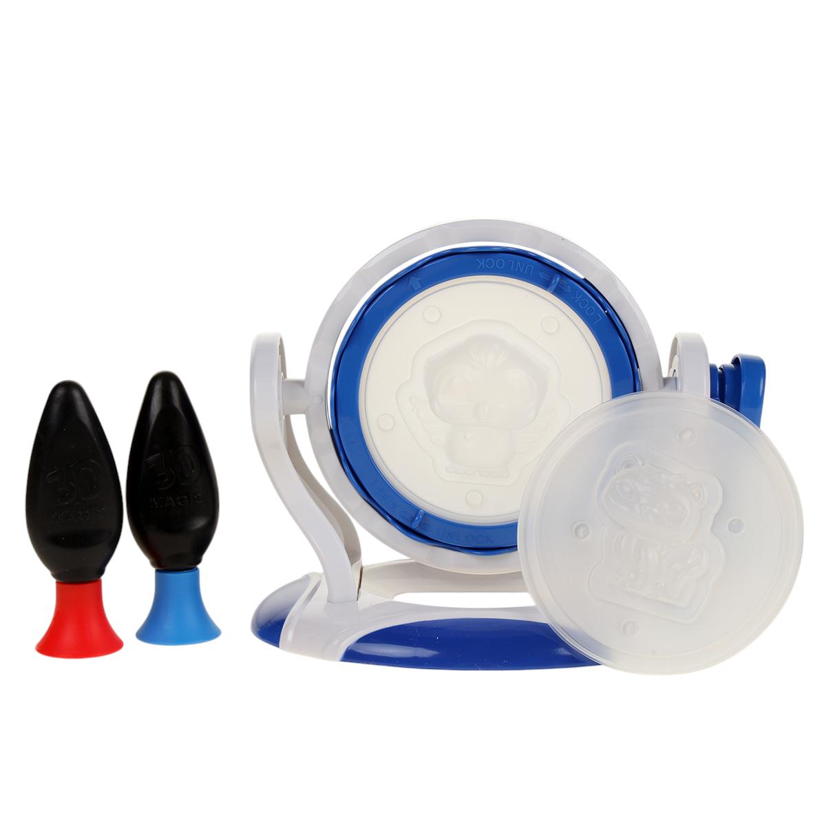Вращающаяся платформа с фиксатором шаблонов, 4 моделирующих трафарета (динозавр, машинка, сова, цветок), 2 флакона с цветным гелем (красный, синий), инструкция с идеями для творчества. УФ-лампа для завершения процесса приобретается отдельно.