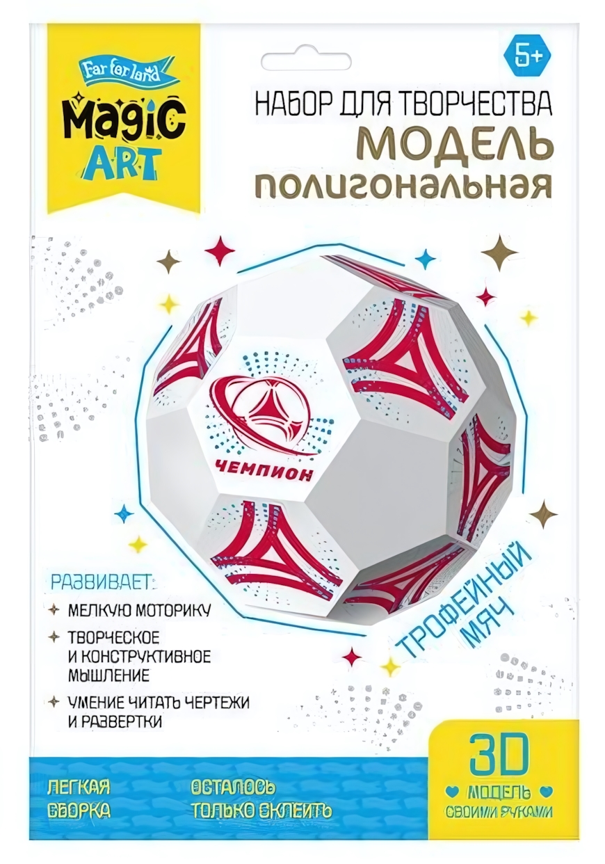 Полигональная модель «Трофейный мяч» — это увлекательный набор для развития пространственного мышления и мелкой моторики у детей от 5 лет. Собирайте реалистичный 3D-макет футбольного мяча вместе с ребёнком, создавая уникальный декор для комнаты или первую победу в коллекции поделок.