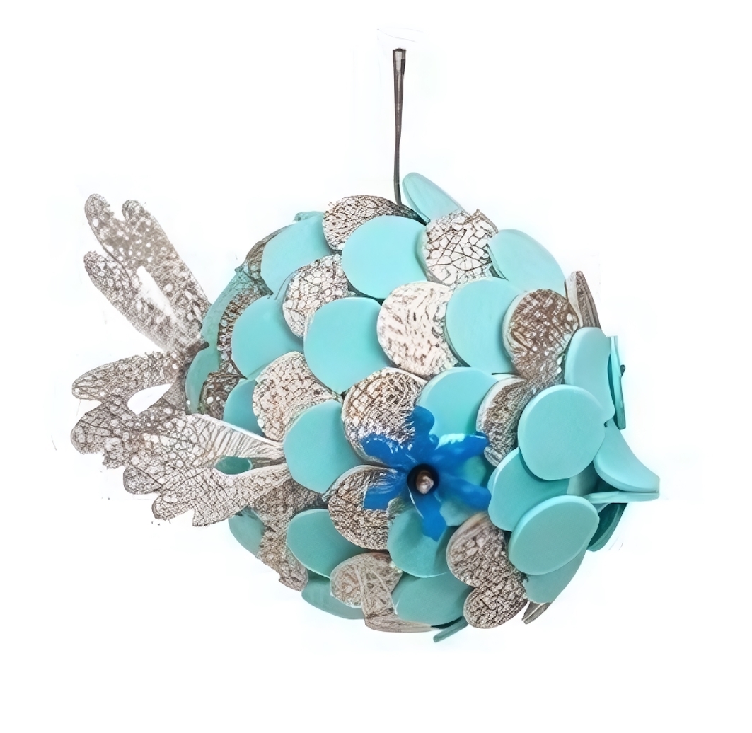 Декоративная рыбка выполнена в нежных голубых тонах с серебристыми элементами, создающими эффект мерцания. Круглые элементы и текстура, напоминающая сеть, придают ей особый шарм. Яркий голубой цветок с перламутровой серединкой добавляет изюминку и делает рыбку еще более привлекательной.