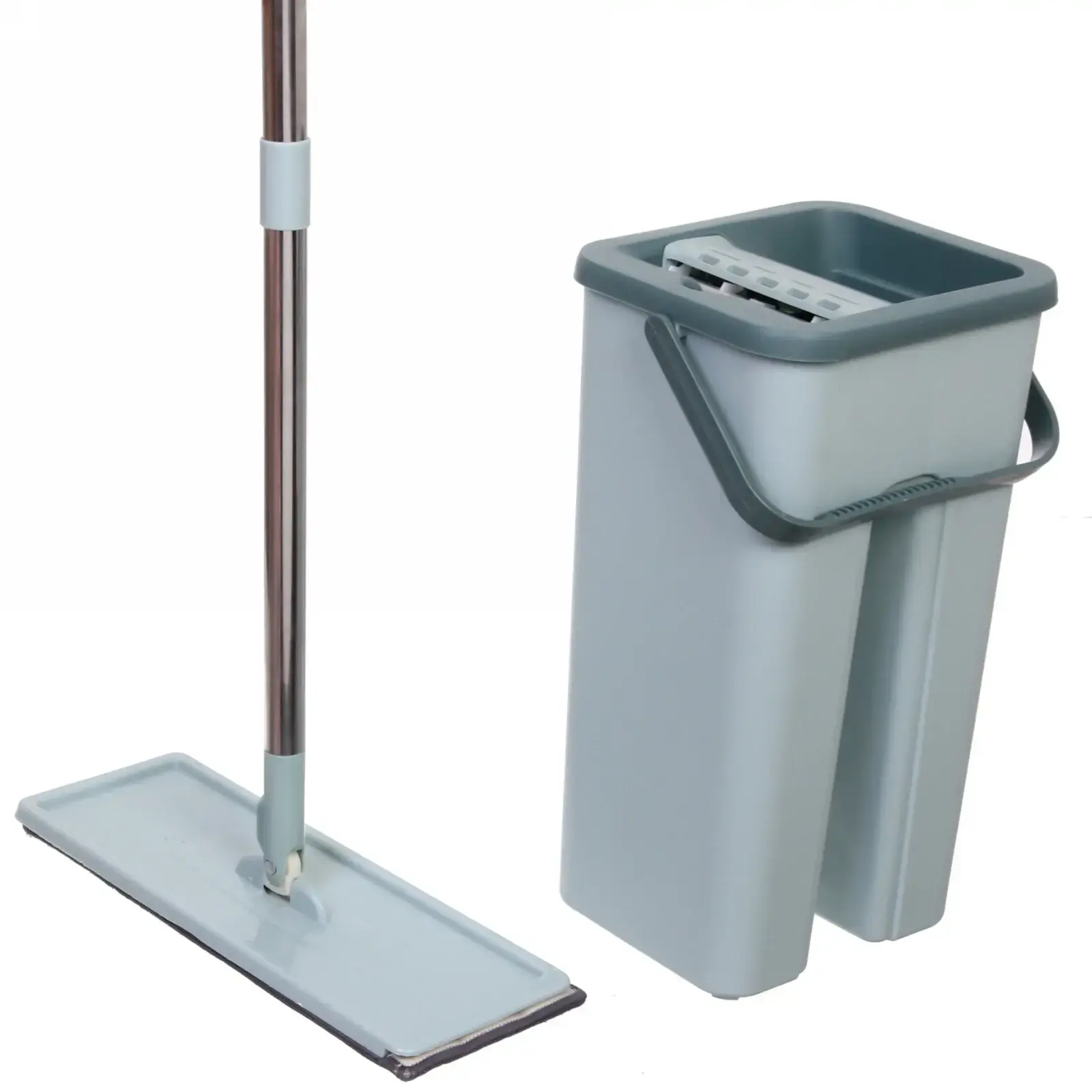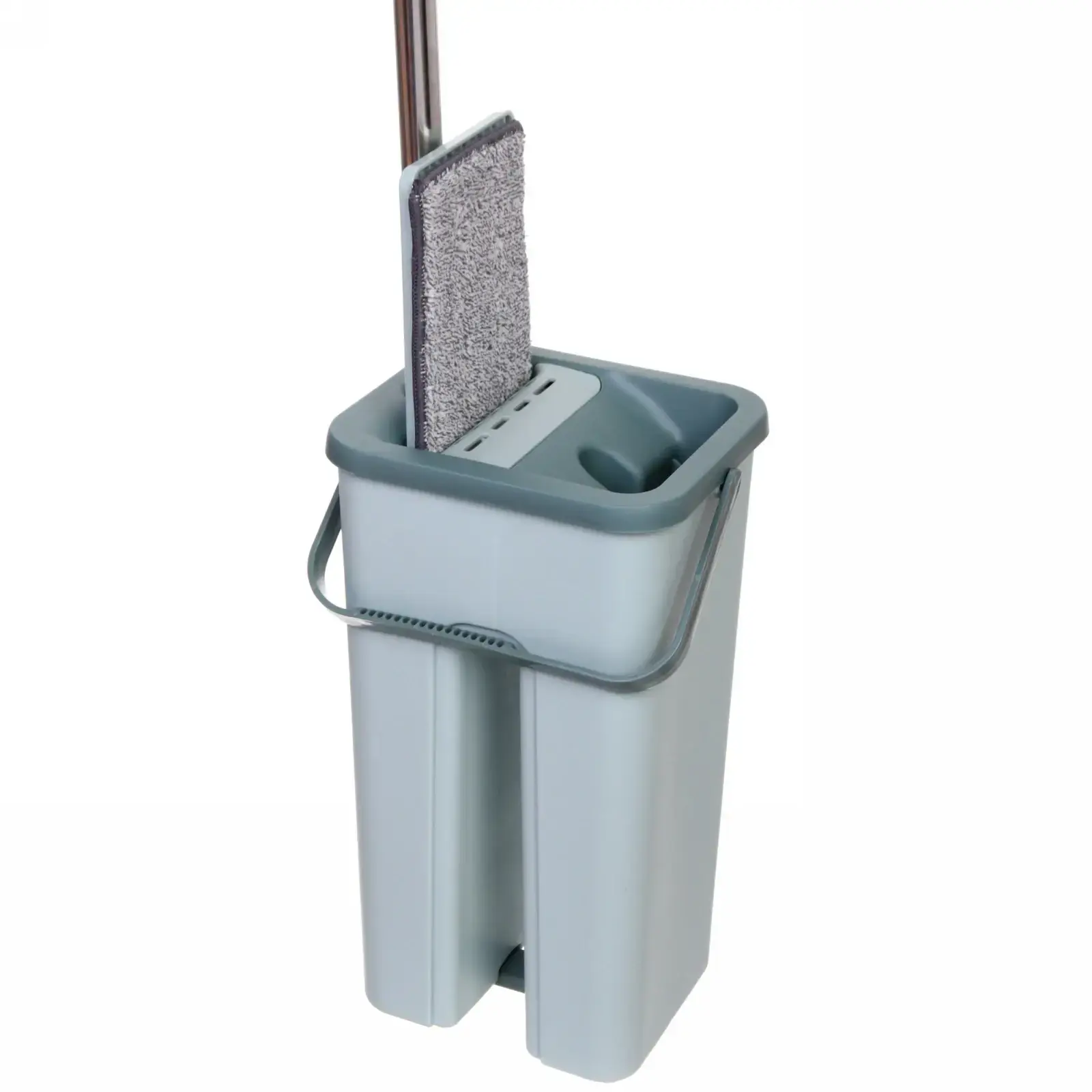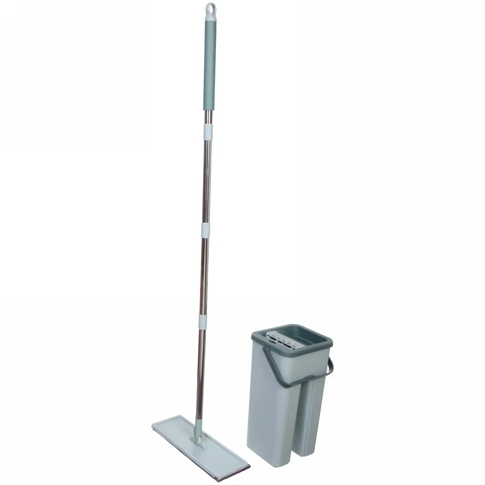 Швабра с поворотным механизмом 180° очищает углы и плинтусы. Двухкомпонентная ручка из нержавеющей стали и термопластика не деформируется при нагрузках. Полипропиленовое ведро устойчиво к ударам и моющим средствам. После использования просто отсоедините насадки для стирки в машинке при 40°C.