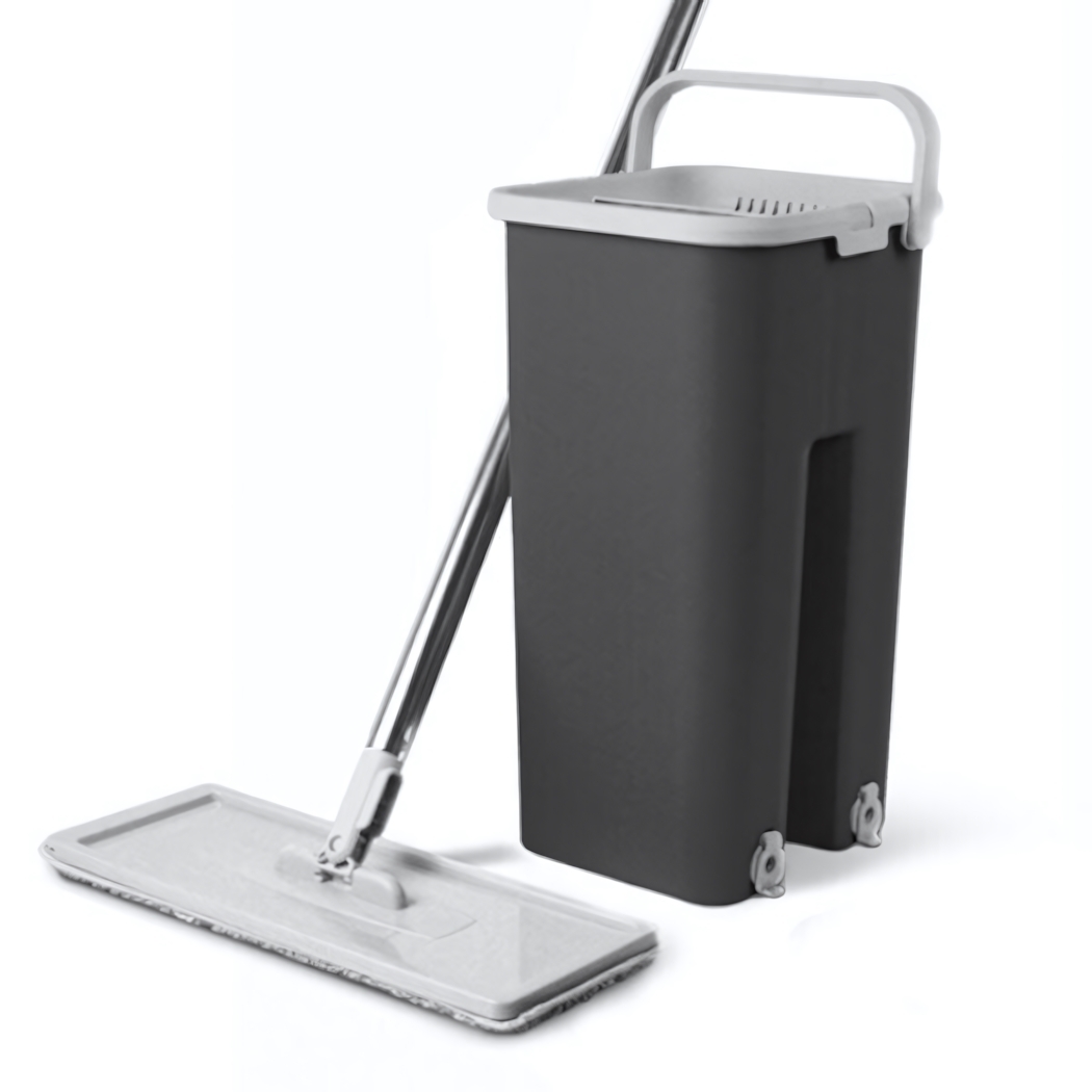 Ведро выполнено из прочного пластика, объём 6 л, оснащено крышкой и удобной ручкой светло‑серого цвета. На дне – два колеса для плавного перемещения. Швабра снабжена металлической (хромированной) ручкой и плоской прямоугольной микрофибровой насадкой, обеспечивающей равномерное распределение влаги. Обе насадки легко снимаются и стираются, что продлевает срок службы набора.
