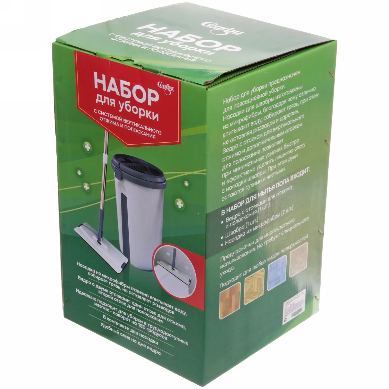 - Ведро с вертикальным отжимом (10 л) разделено на два отсека — для чистой воды и полоскания