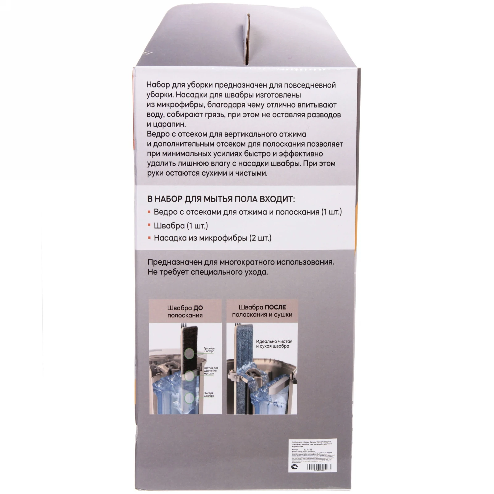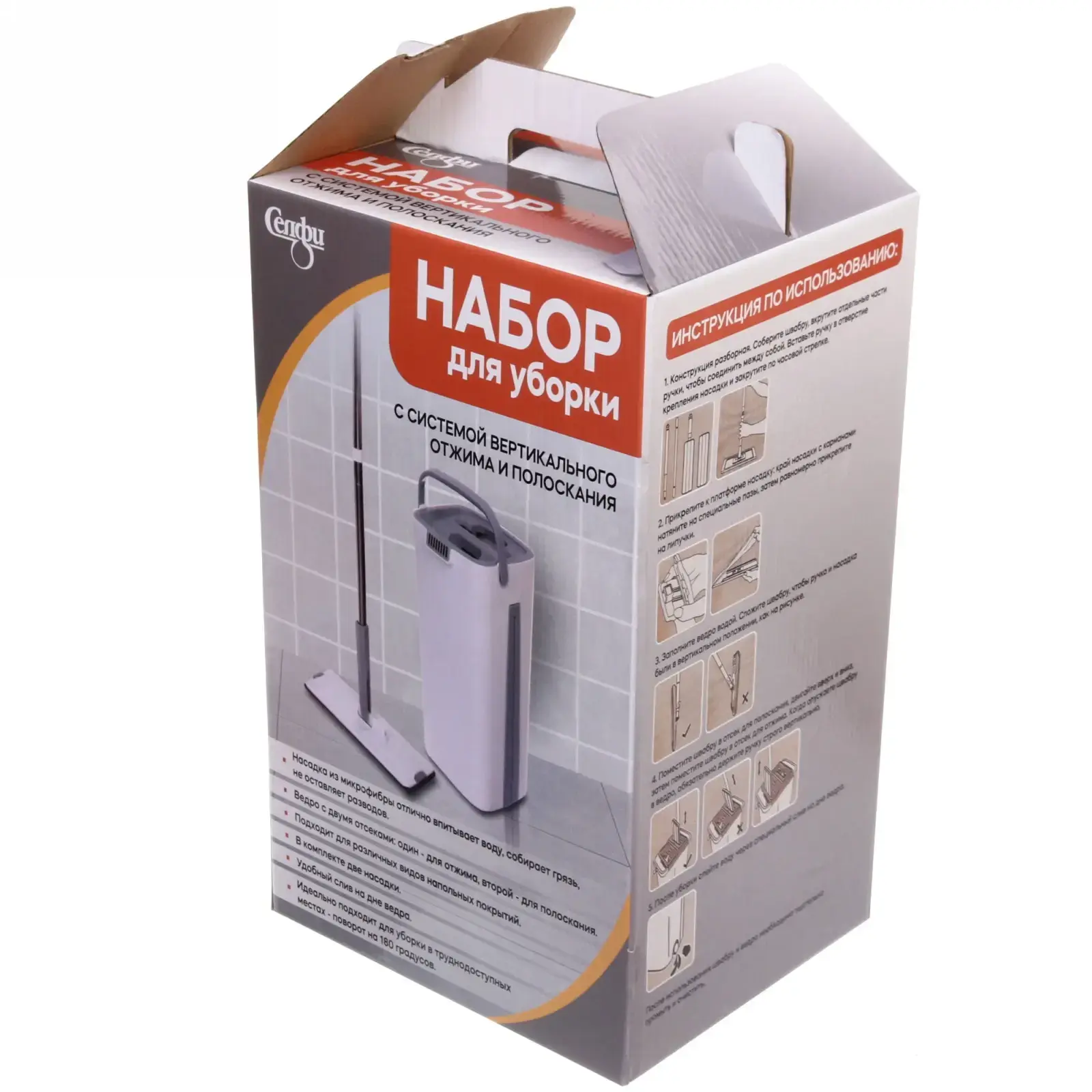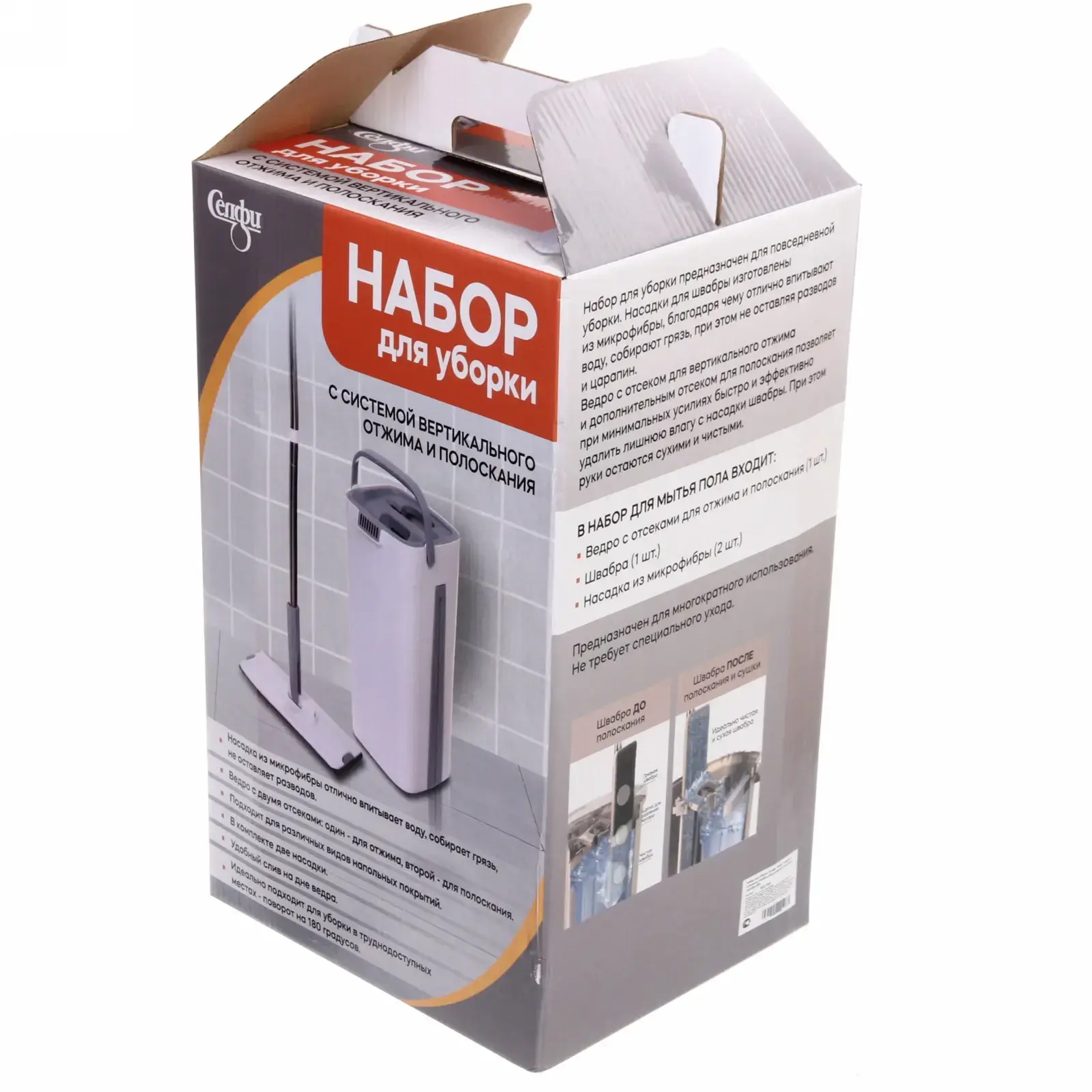 Набор «Селфи» Клио — это революция в домашней уборке. Уникальная система вертикального отжима и поворотная швабра на 180° справятся с загрязнениями в углах, за мебелью и других труднодоступных местах. Больше не нужно наклоняться или использовать несколько инструментов — всё необходимое уже в комплекте!
