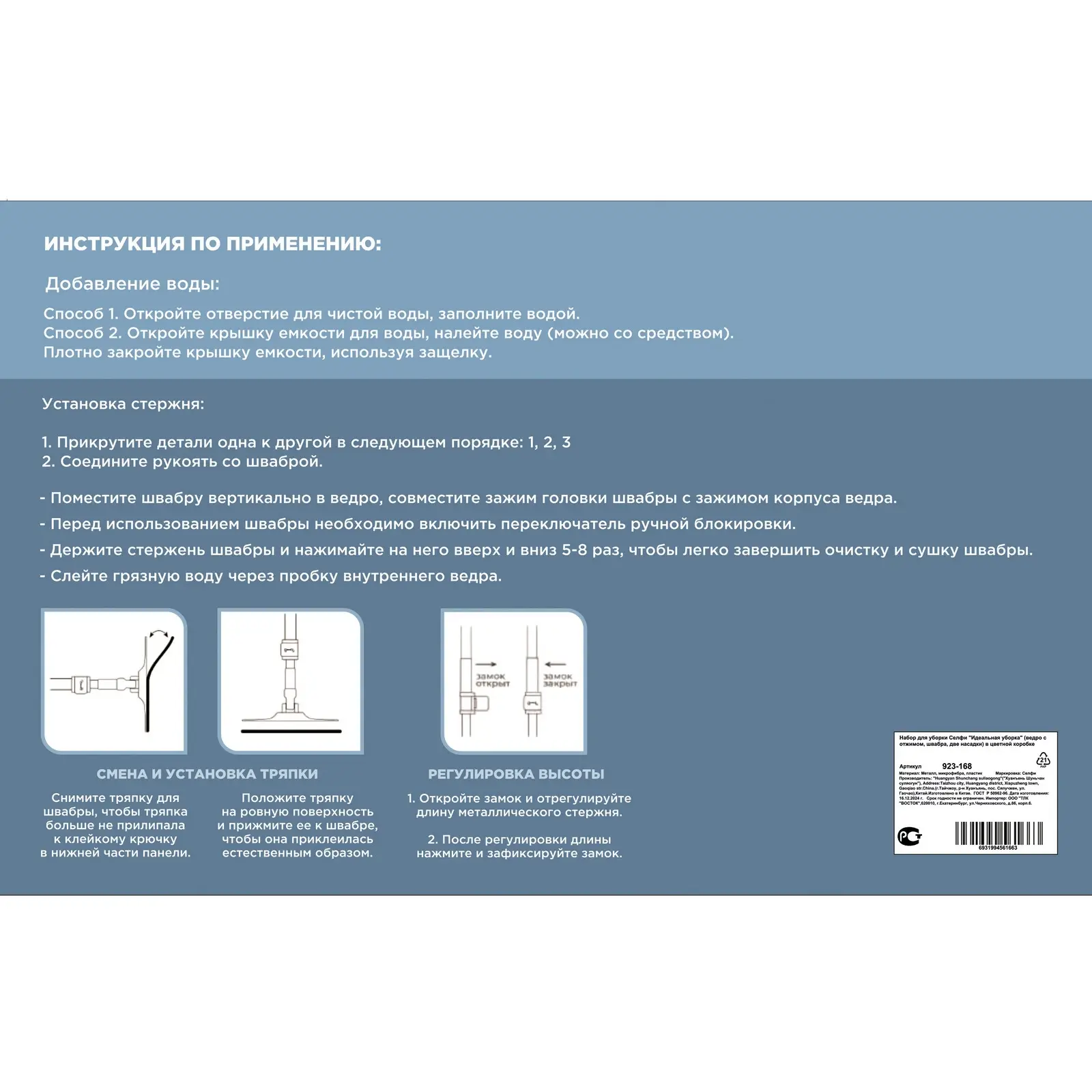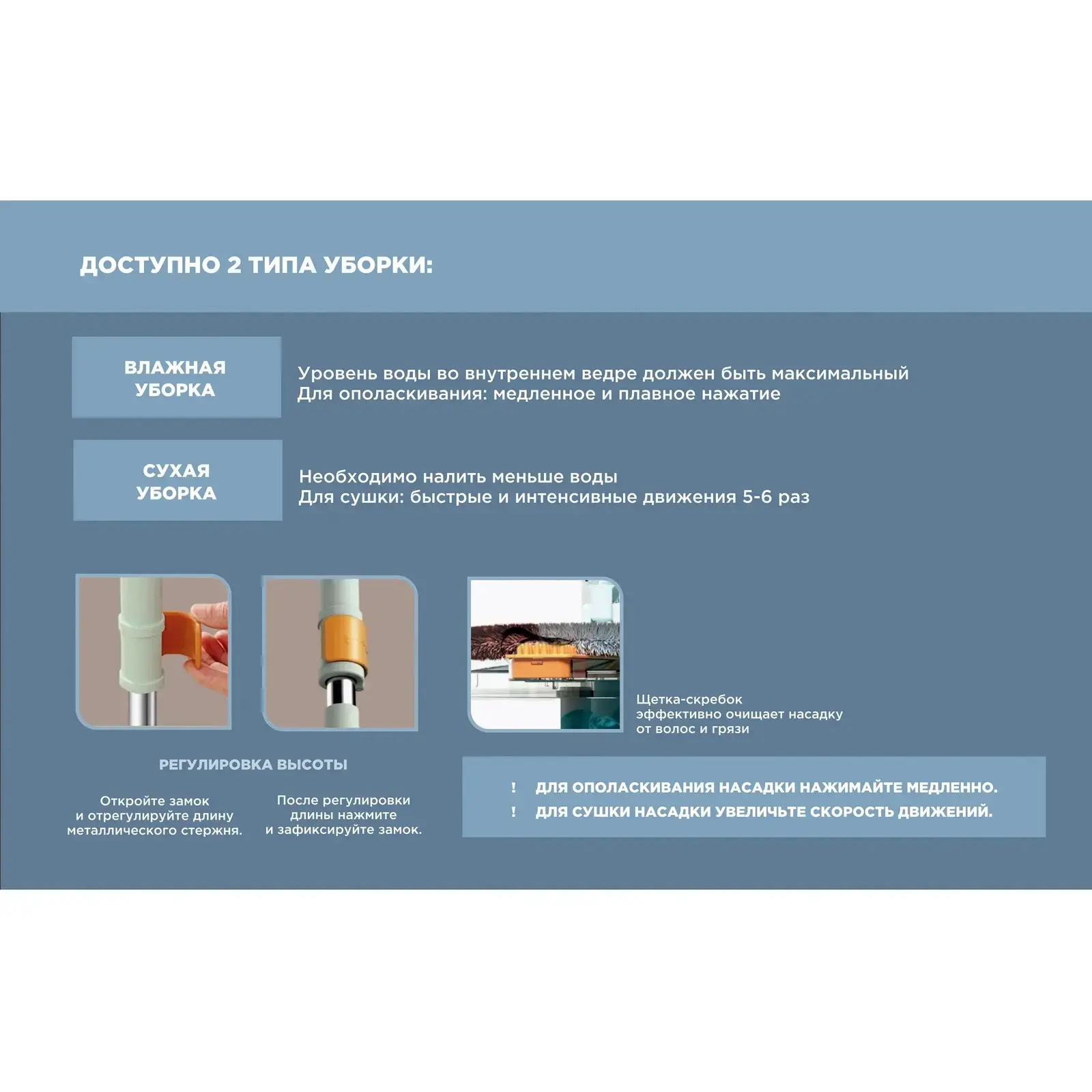 Набор подходит для уборки как в домашних условиях, так и в офисах. Ведро с двумя отсеками позволяет удобно разделять чистую и грязную воду, а швабра с телескопической ручкой легко регулируется по высоте, что делает уборку комфортной для людей любого роста. Насадки из микрофибры эффективно собирают пыль и грязь, обеспечивая идеальную чистоту на любых поверхностях.