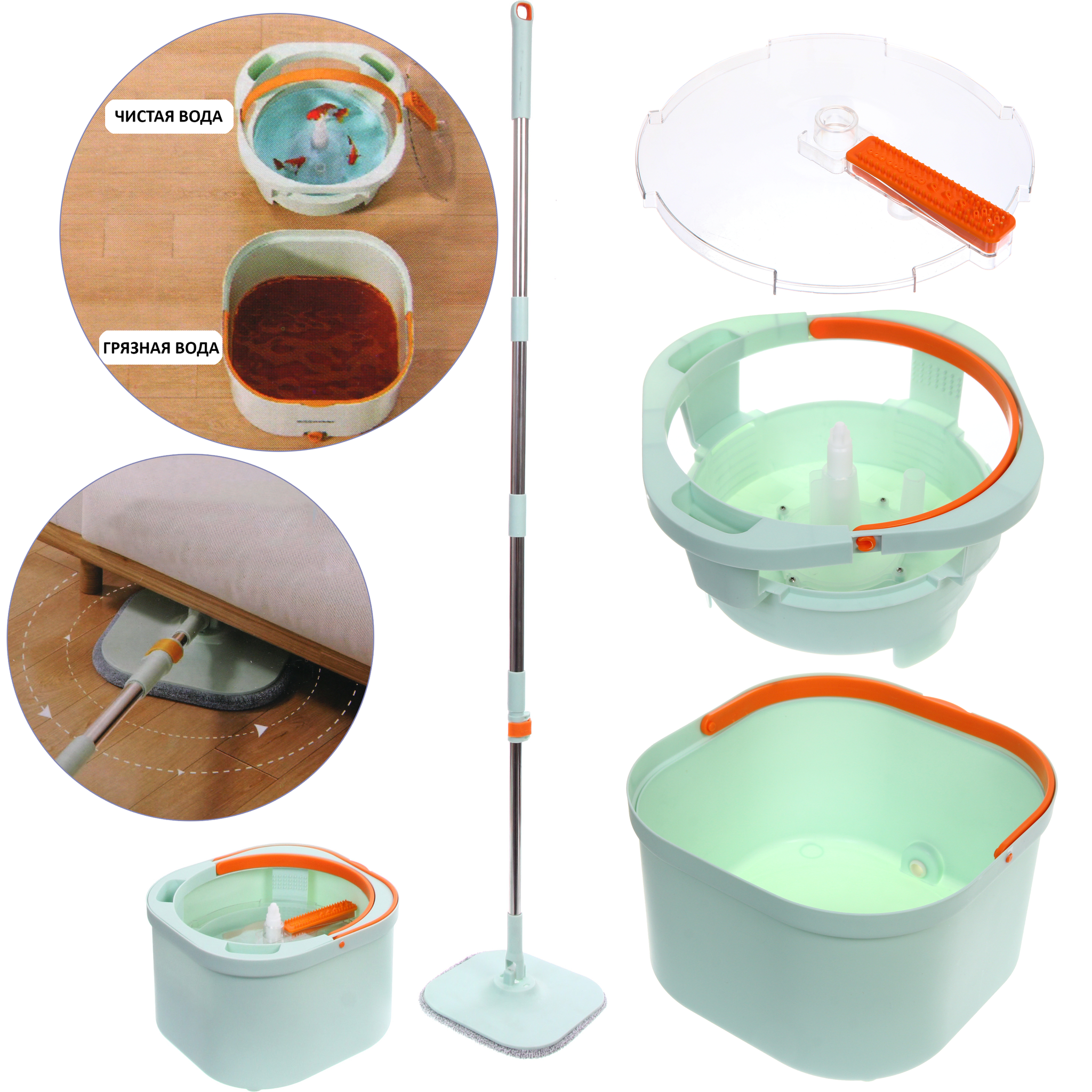 Комплект с инновационной системой отжима и вращающейся платформой для безупречного результата на любых поверхностях. Идеально подходит для плитки, ламината и линолеума.
