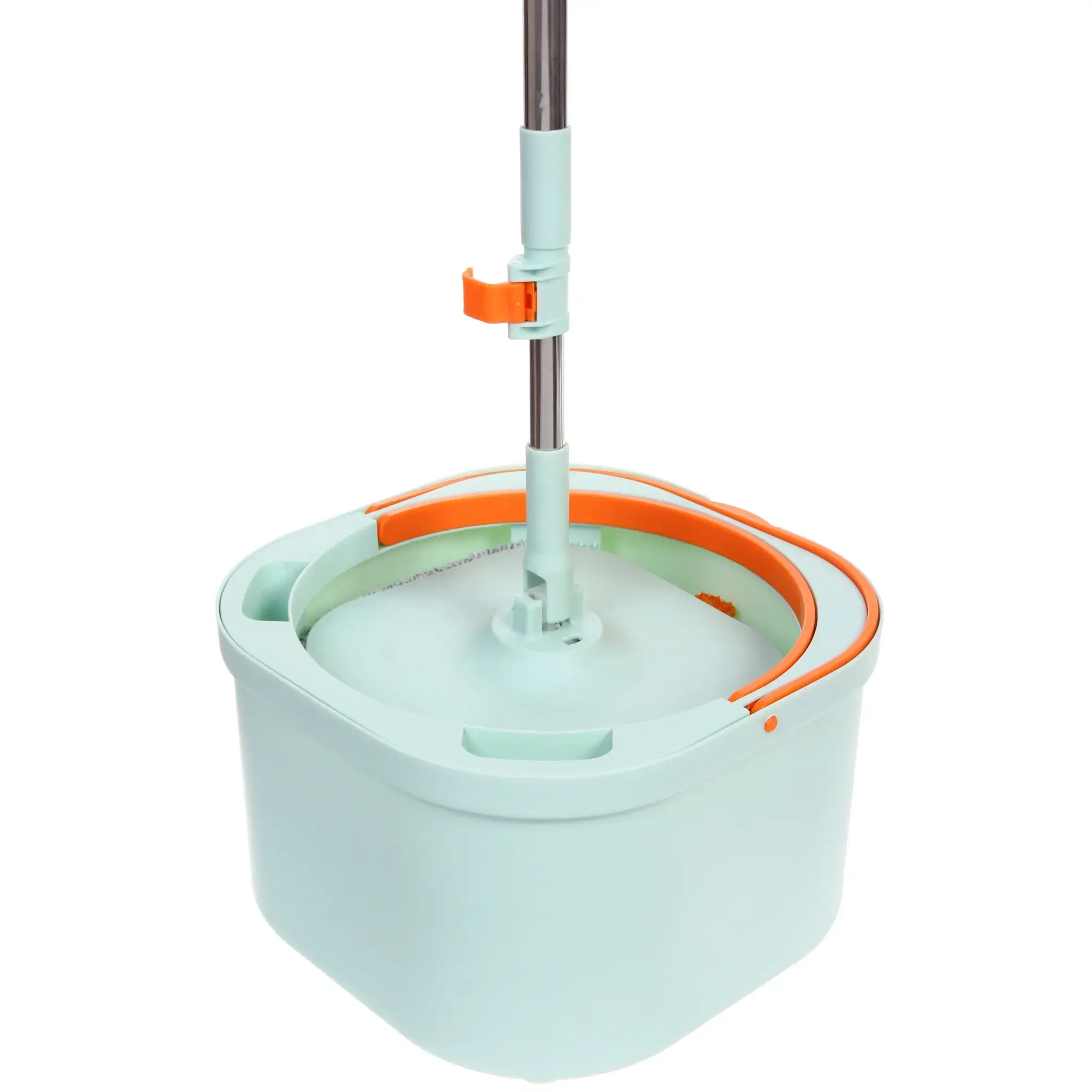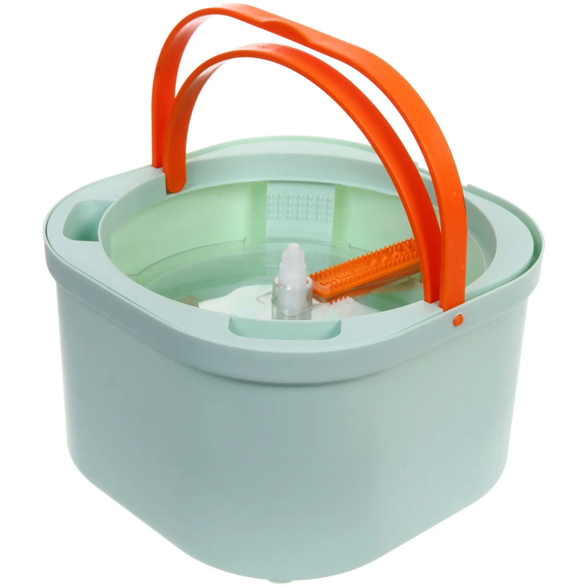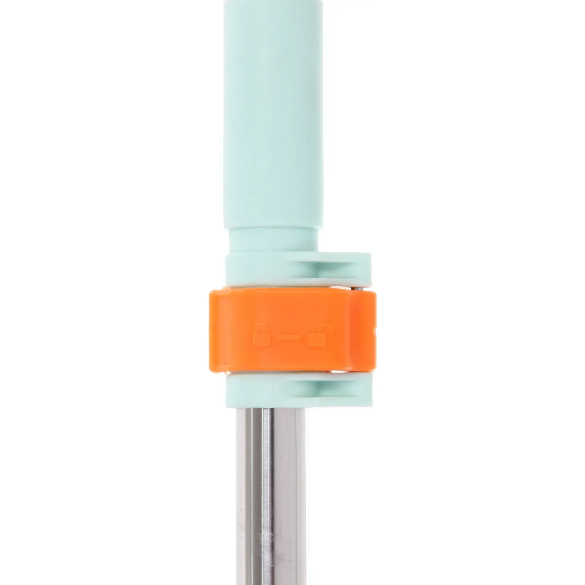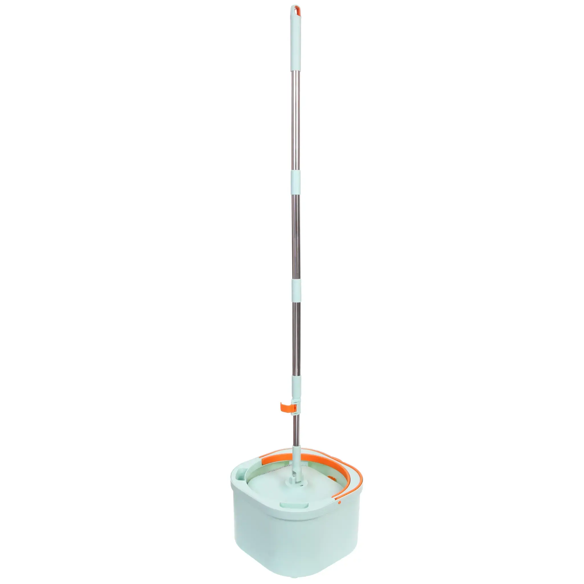 Металлическая телескопическая трубка с фиксацией положения, пластиковый корпус ведра устойчив к деформации, насадки из плотной микрофибры (состав: 80% полиэстер, 20% полиамид). Цветовая гамма: светло-зеленый корпус с оранжевыми акцентами.