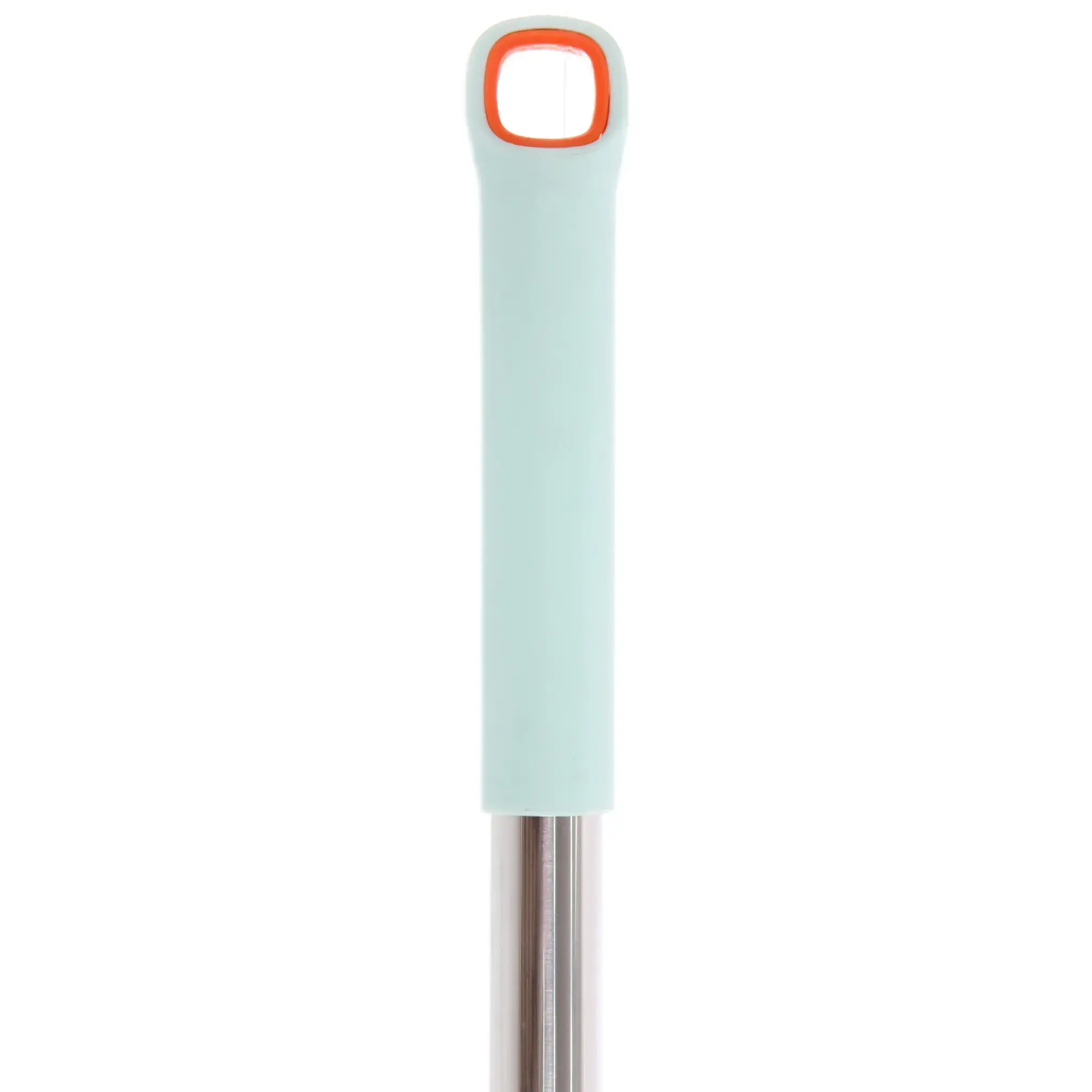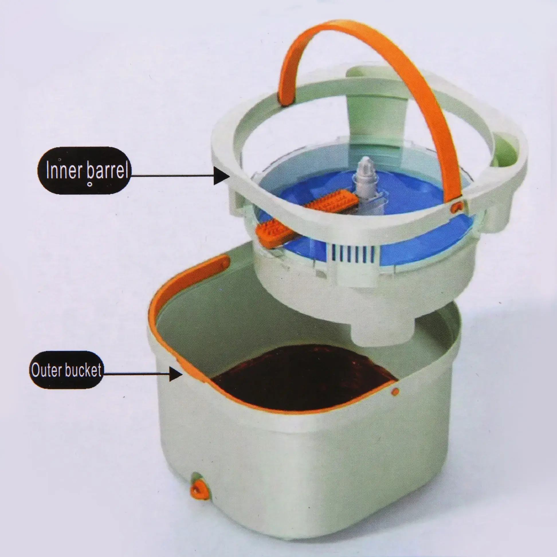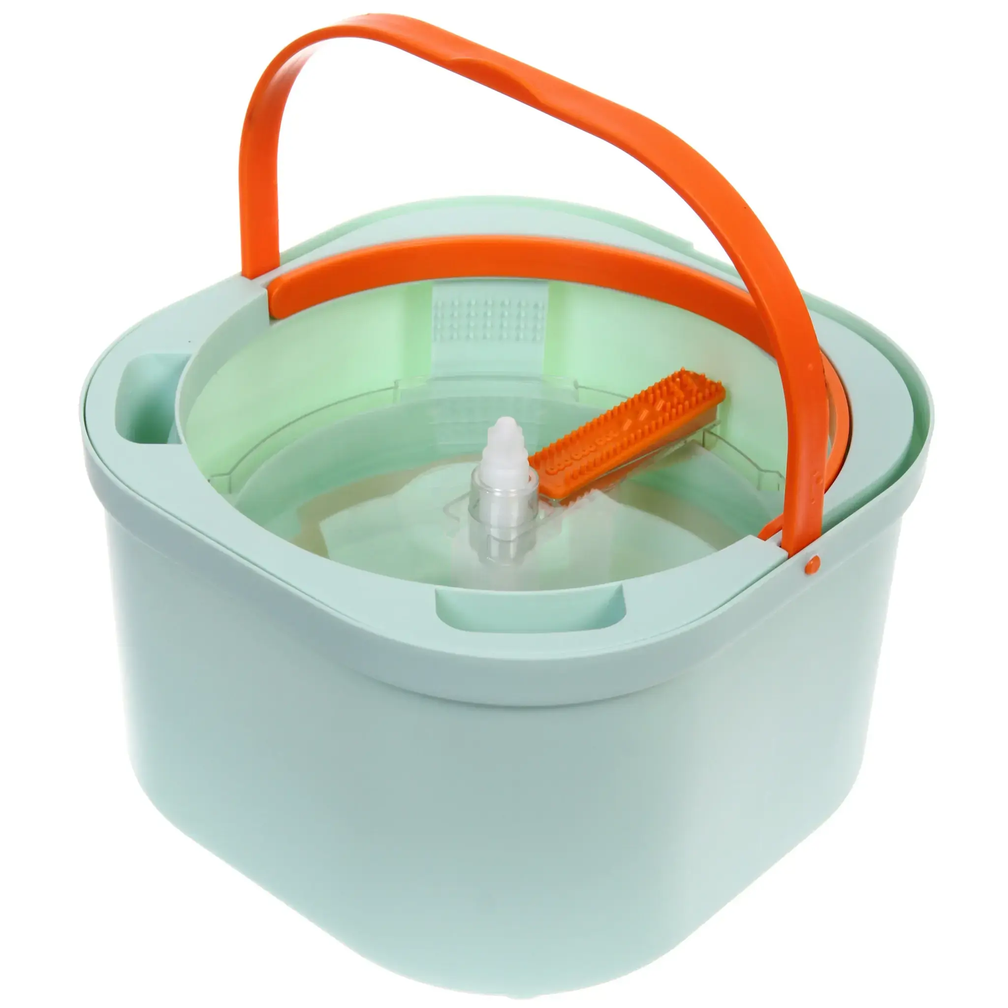 Металлическая телескопическая трубка с фиксацией положения, пластиковый корпус ведра устойчив к деформации, насадки из плотной микрофибры (состав: 80% полиэстер, 20% полиамид). Цветовая гамма: светло-зеленый корпус с оранжевыми акцентами.