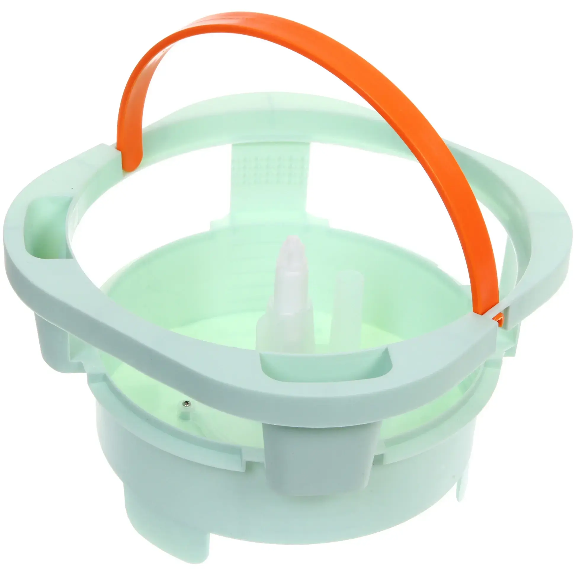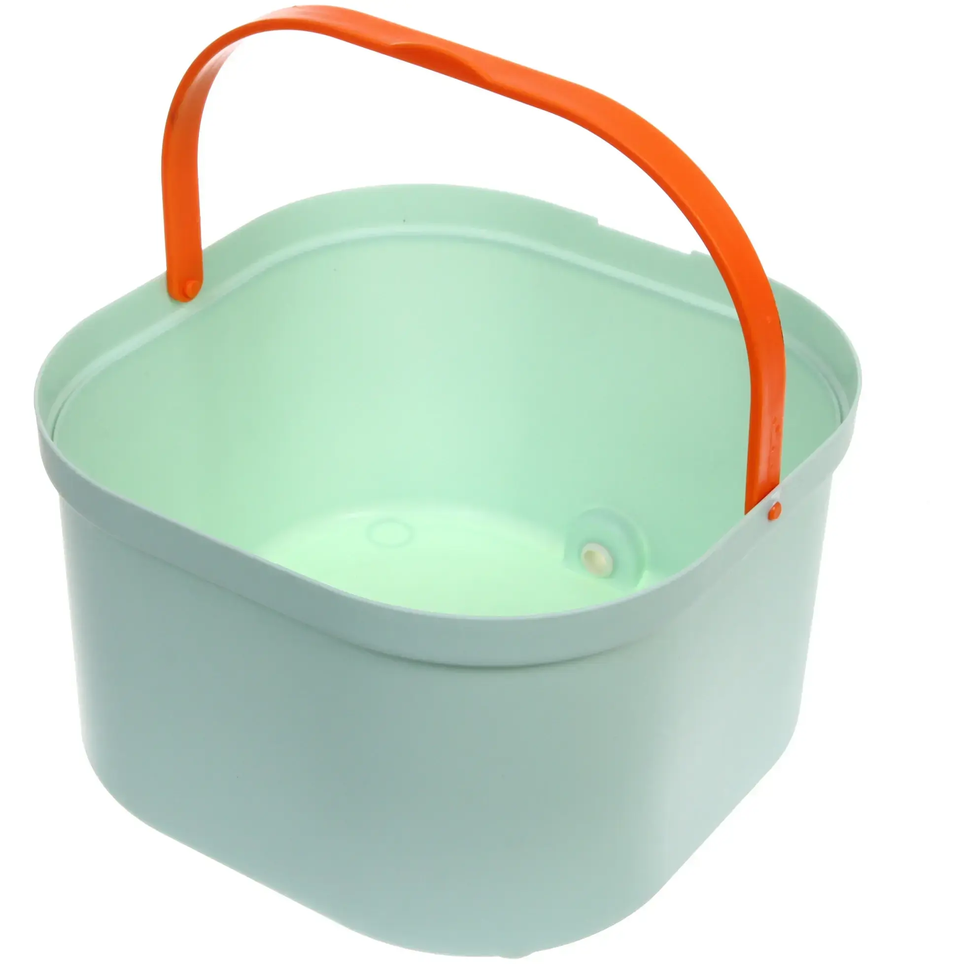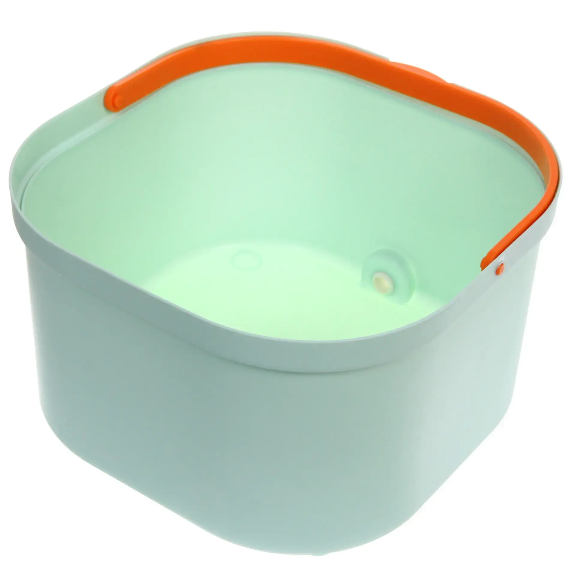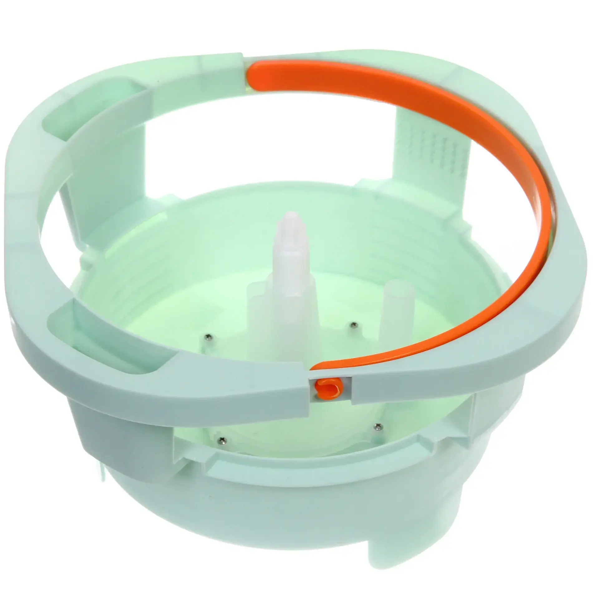 Металлическая телескопическая трубка с фиксацией положения, пластиковый корпус ведра устойчив к деформации, насадки из плотной микрофибры (состав: 80% полиэстер, 20% полиамид). Цветовая гамма: светло-зеленый корпус с оранжевыми акцентами.