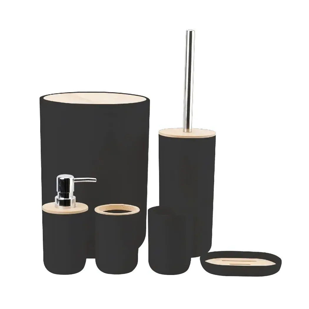 Выбирая набор «Бамбук», вы получаете не только стильные аксессуары, но и практичные решения для вашей ванной. Черный цвет с элементами из светлого дерева придаёт набору элегантный вид, а высококачественные материалы обеспечивают долговечность и надежность. Этот набор станет отличным выбором для тех, кто ценит комфорт и функциональность.