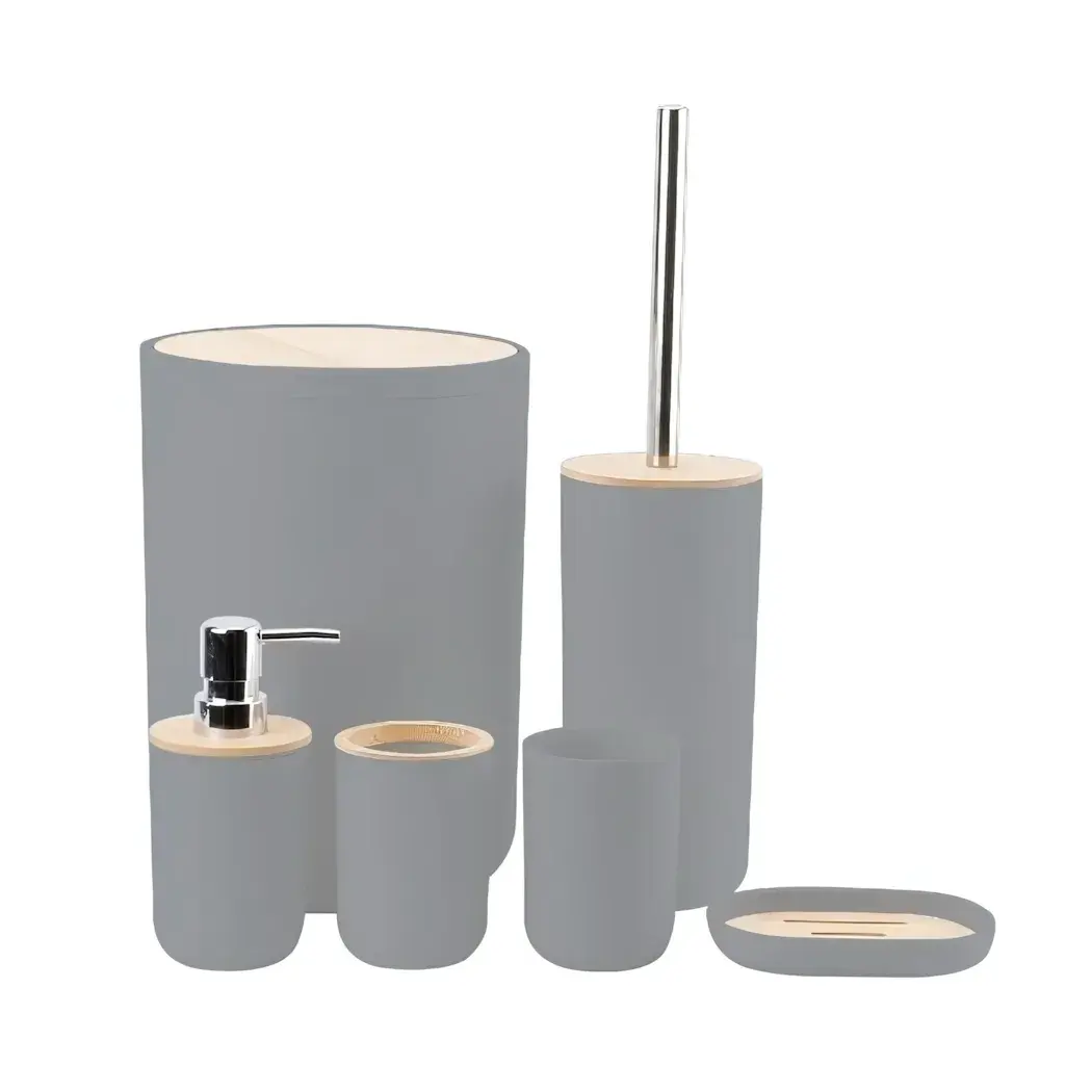 Выбирая этот набор, вы получаете не только стильный, но и практичный аксессуар для ванной. Изготовленный из качественного пластика с элементами бамбука, он отличается долговечностью и легкостью в уходе. Серый цвет и деревянные детали придают набору элегантный вид, который будет гармонировать с любым дизайном ванной комнаты.