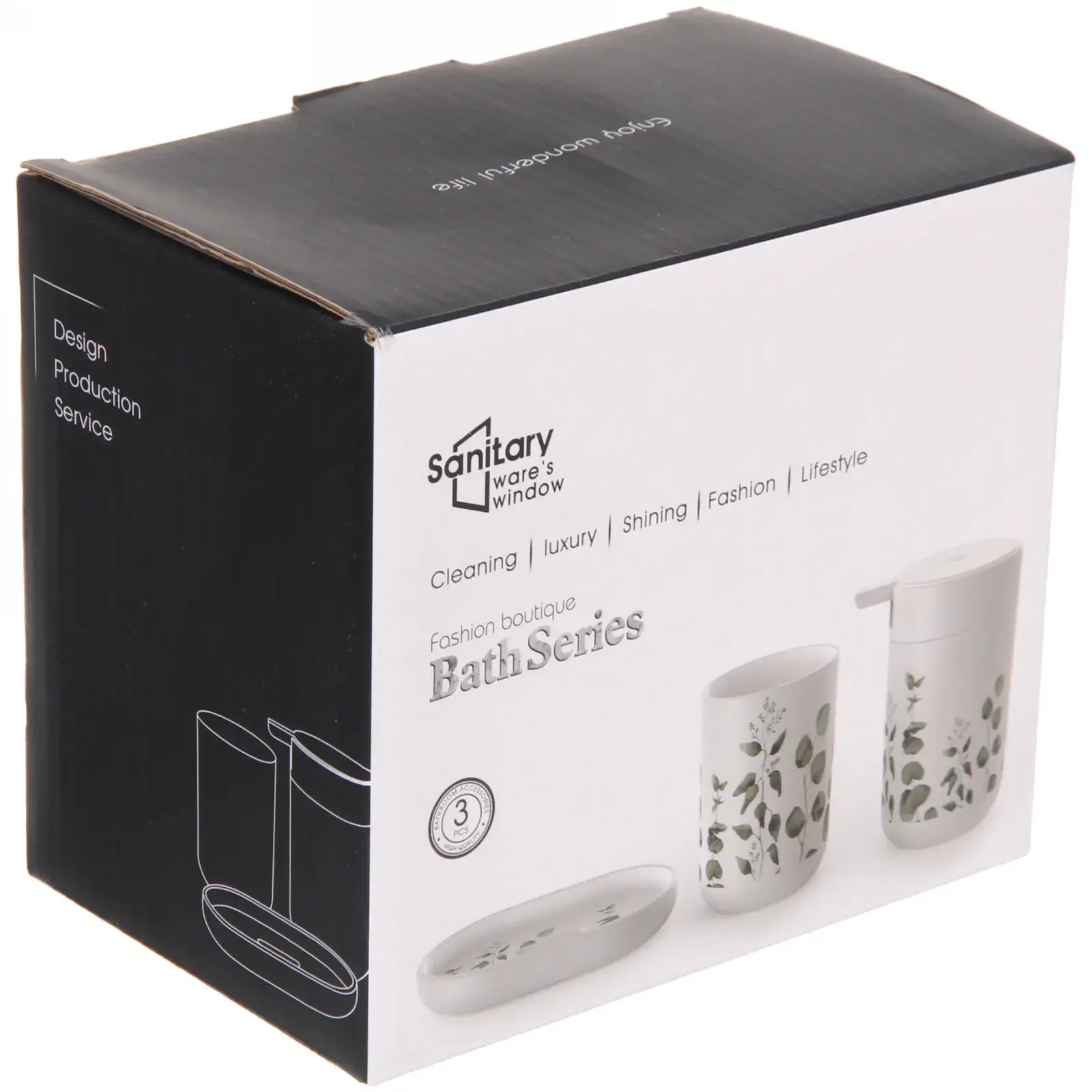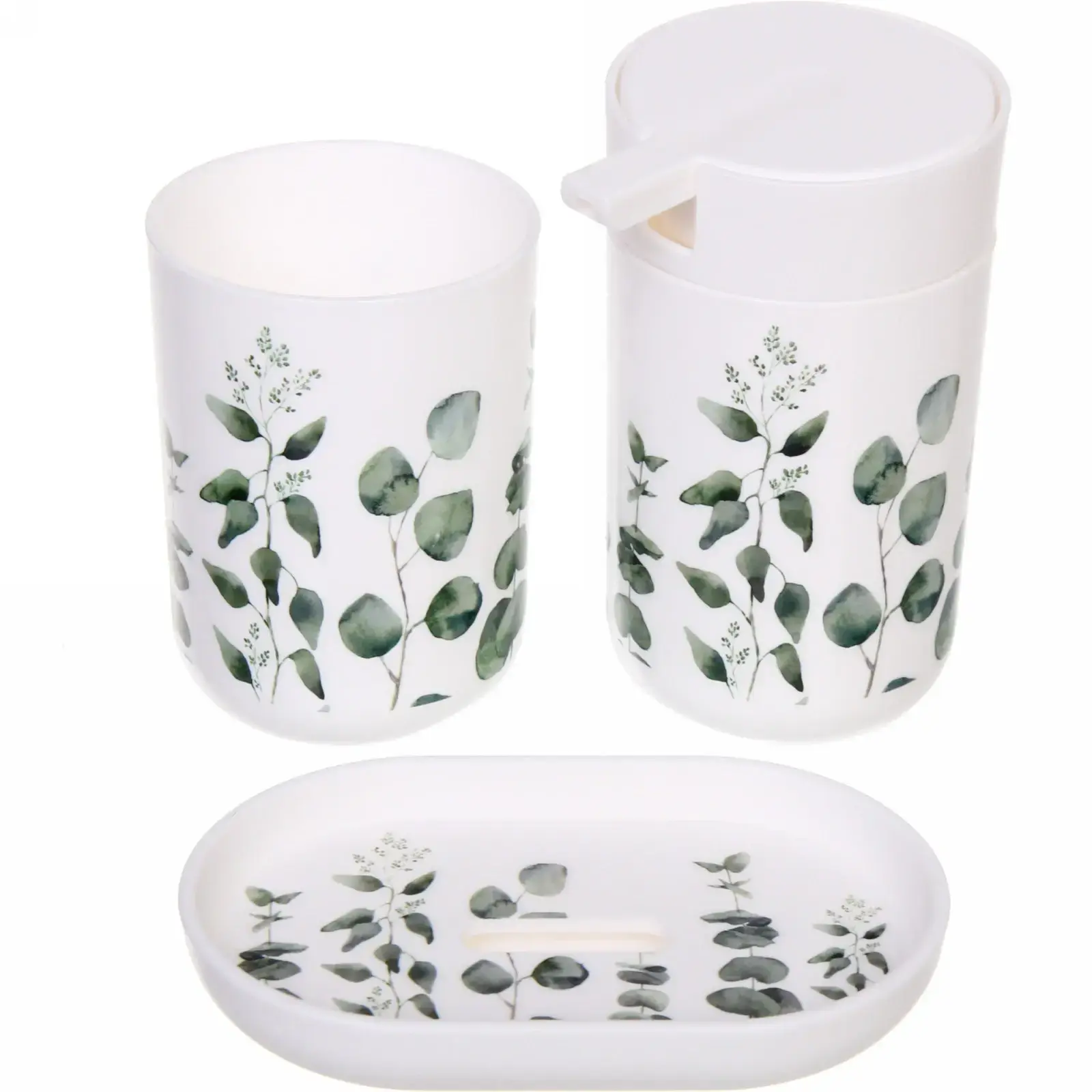 Все предметы набора выполнены в белом цвете с зелеными растительными узорами, что придаёт им свежий и современный вид. Размеры и форма каждого элемента обеспечивают удобство в использовании и легкость в уходе. Набор станет отличным дополнением к вашему интерьеру и поможет поддерживать порядок в ванной комнате.
