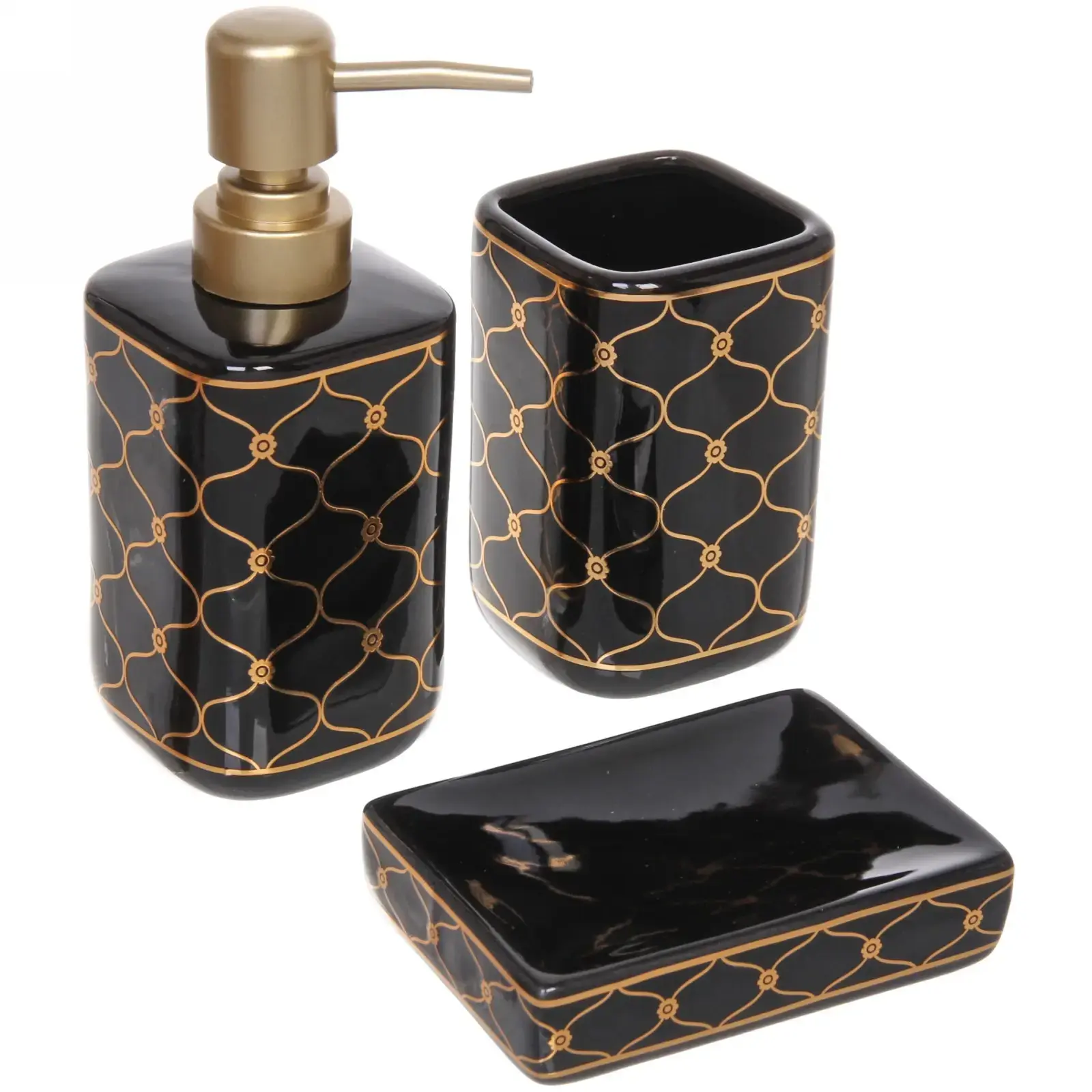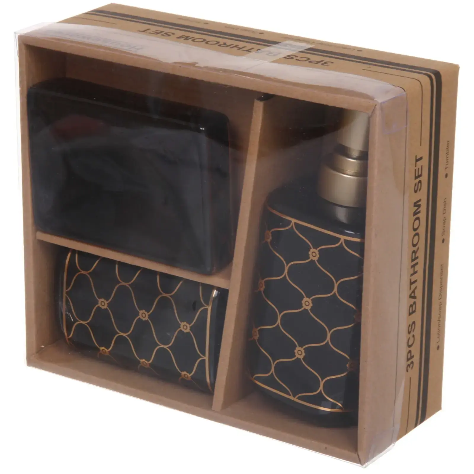 Набор из трёх керамических аксессуаров создаст атмосферу роскоши и упорядоченности в вашей ванной комнате. Сочетание глубокого чёрного фона с позолоченными геометрическими узорами добавит интерьеру современный лоск, а продуманная функциональность каждого предмета сделает ежедневные ритуалы комфортнее.