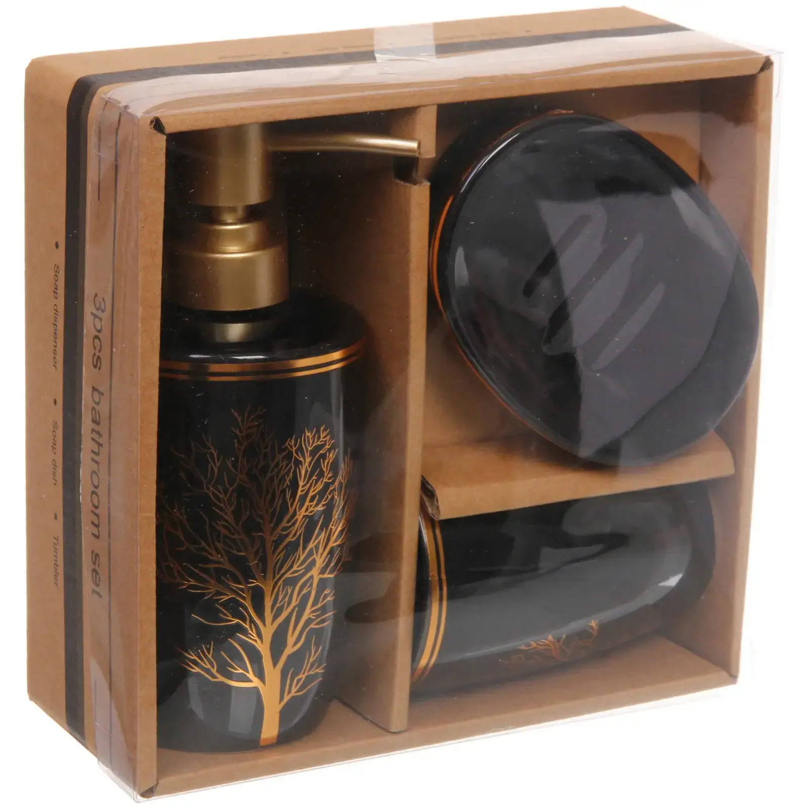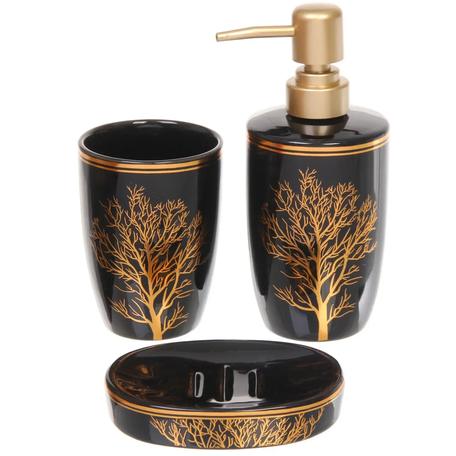 Каждый элемент набора имеет гладкую текстуру и стильный дизайн с деревообразными узорами, выполненными в золотом цвете. Размеры предметов стандартные для подобного набора, что делает их универсальными для любого интерьера. Упаковка из прозрачного материала позволяет увидеть содержимое, что делает набор отличным вариантом для подарка.