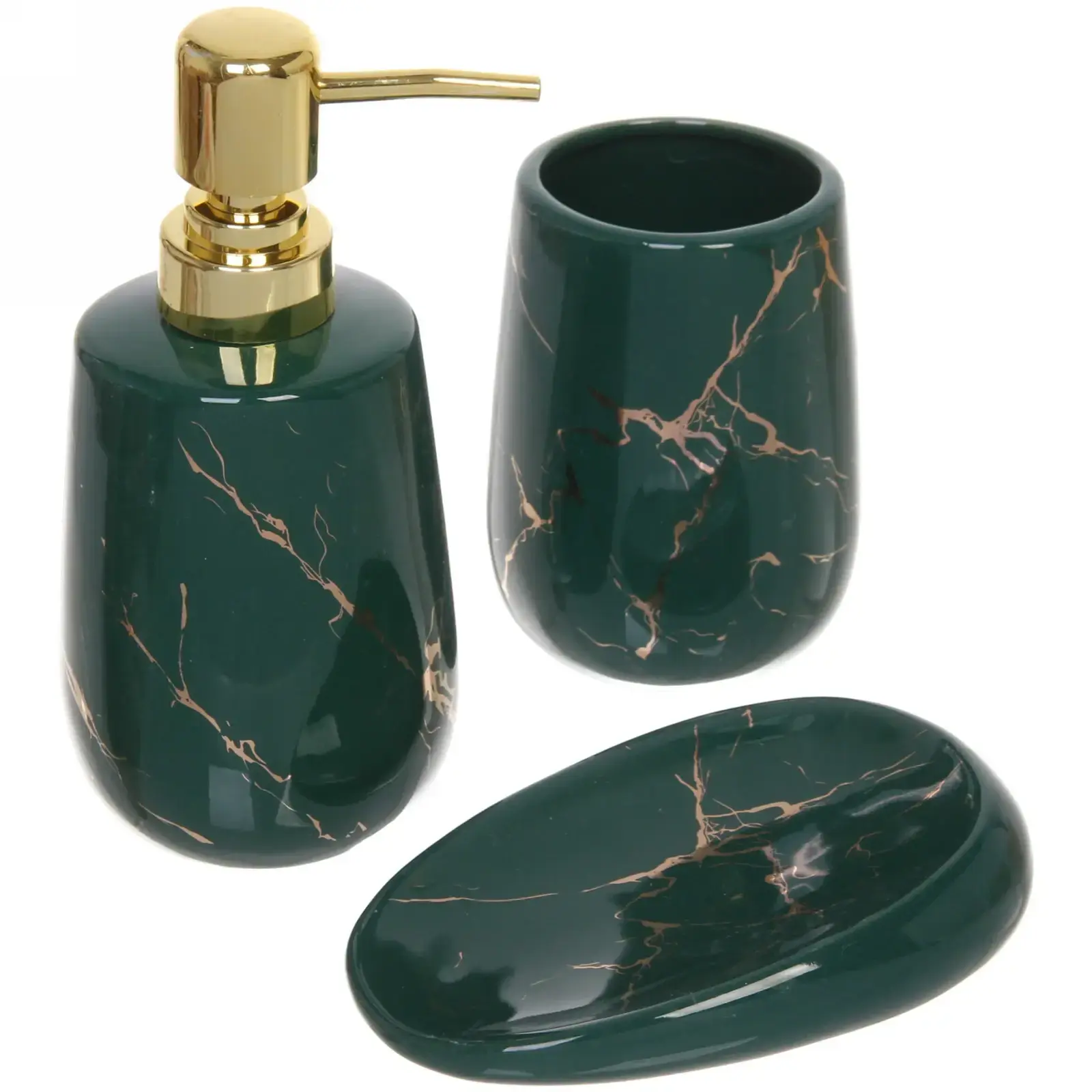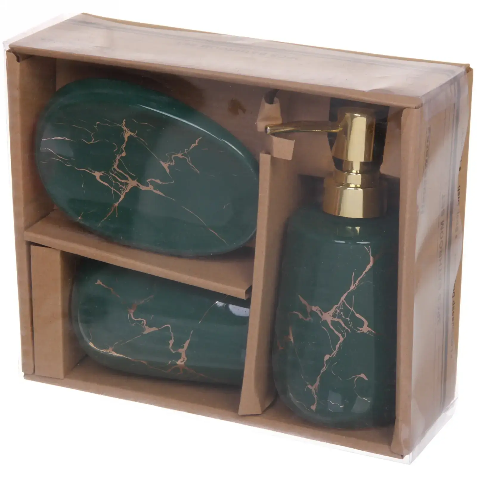 Каждый элемент набора имеет округлую форму и выполнен в изумрудном цвете с золотистыми мраморными линиями, что придаёт ему уникальный вид. Набор упакован в картонную коробку с прозрачной крышкой, что делает его отличным вариантом для подарка. Обновите свою ванную комнату с набором «Фелиса» и наслаждайтесь комфортом и стилем каждый день!