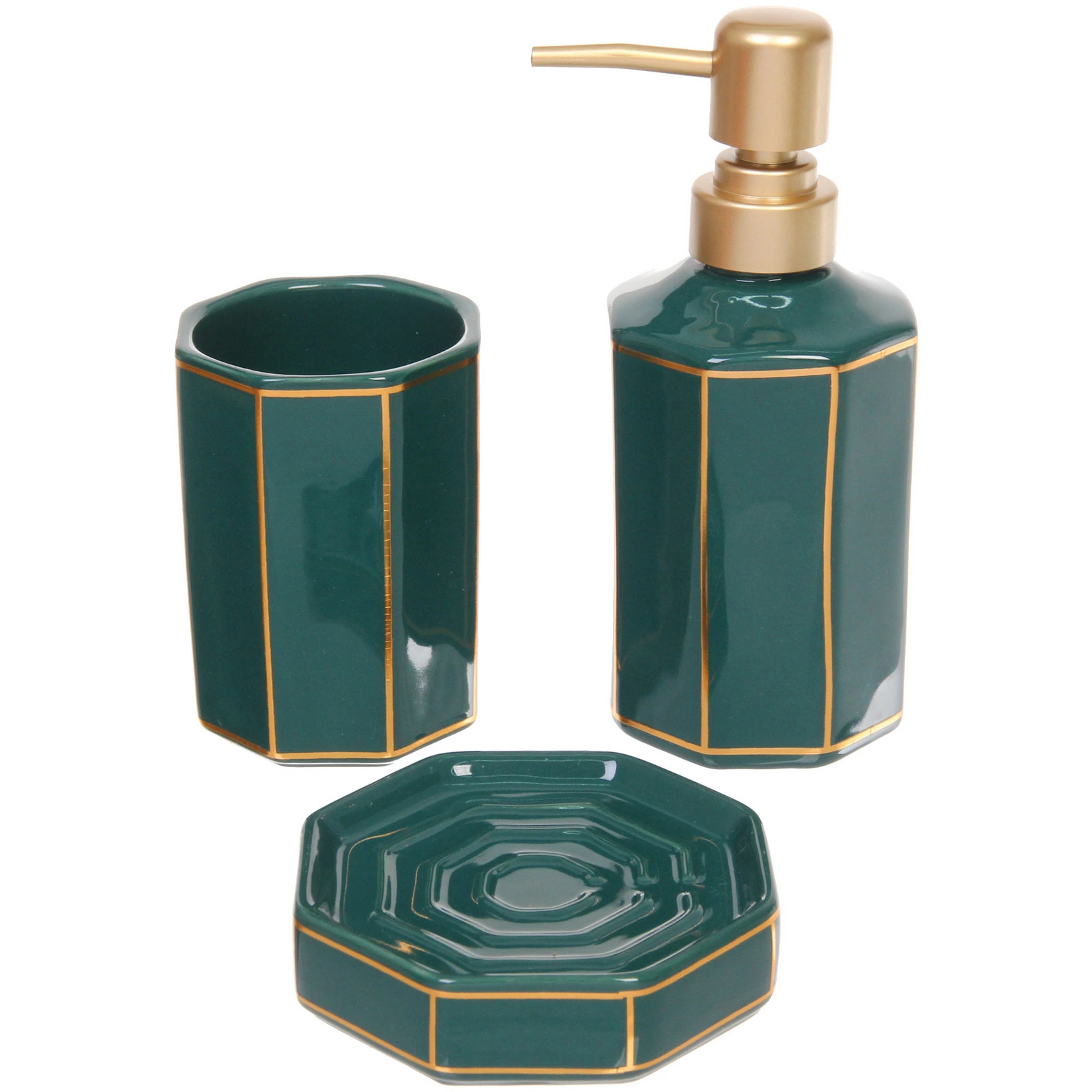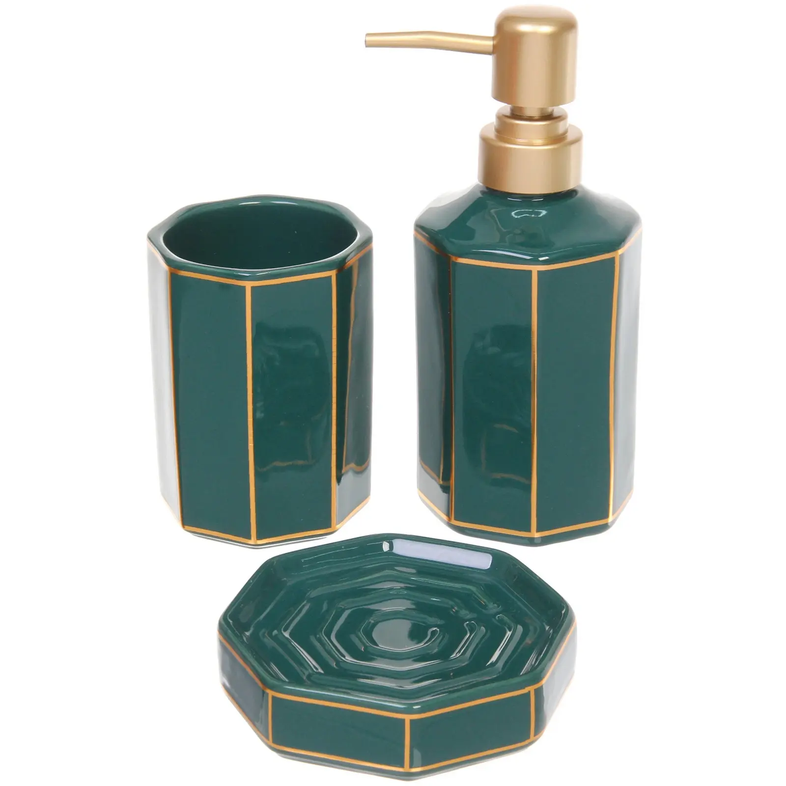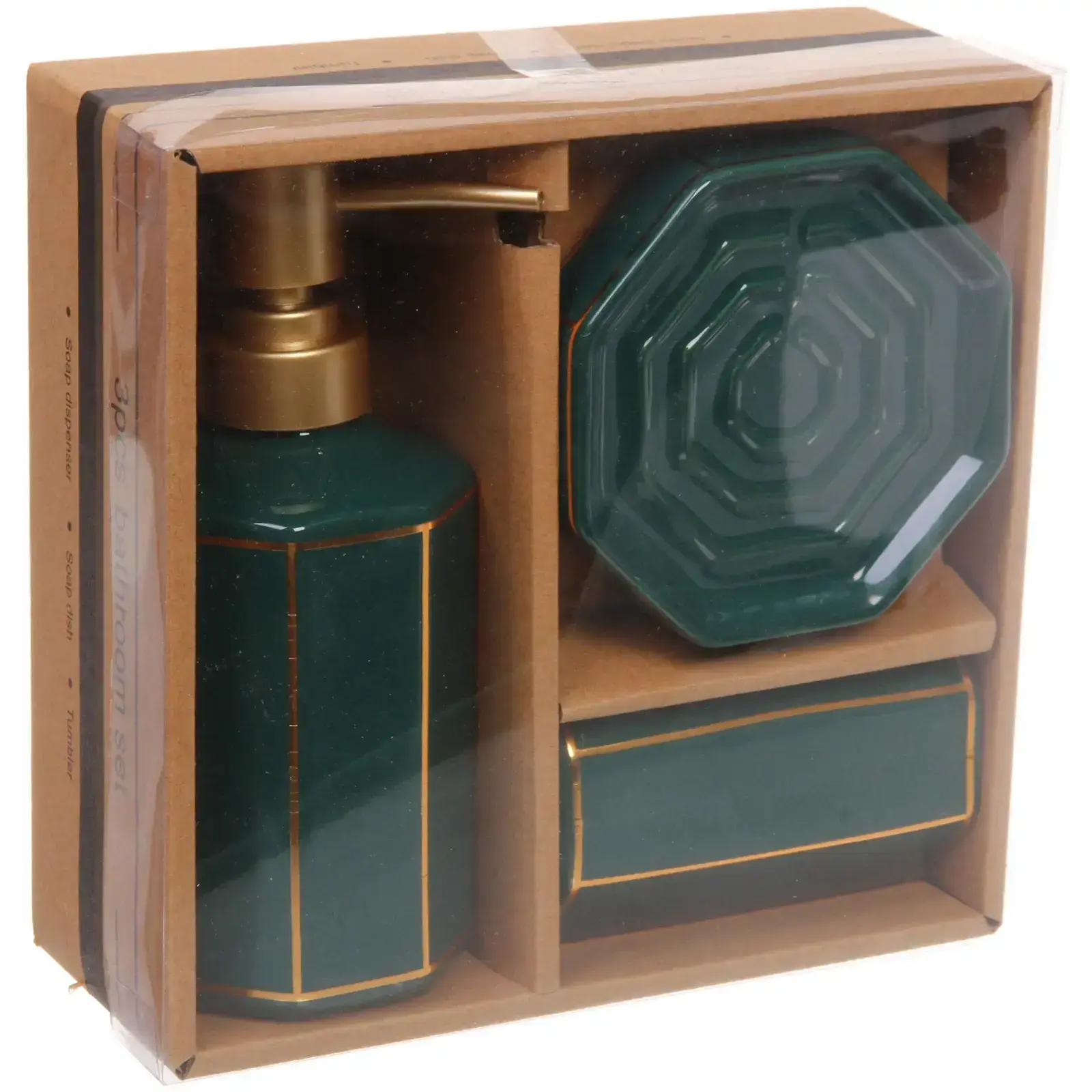 Преобразите вашу ванную комнату с набором для ванной из 3-х предметов керамического исполнения «Грани». Этот стильный комплект в изумрудном цвете не только украсит ваш интерьер, но и обеспечит удобство в использовании. Каждый элемент набора был создан с акцентом на качество и долговечность, что делает его идеальным выбором для вашего дома.
