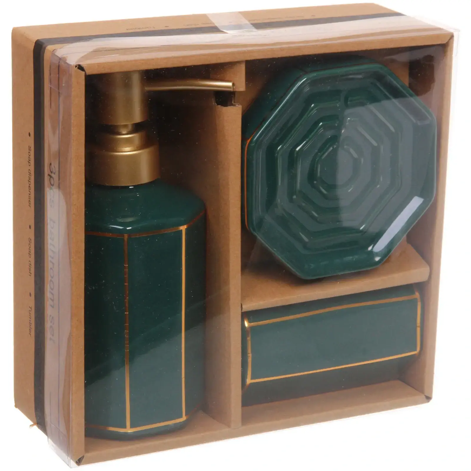 Размеры и форма каждого предмета тщательно продуманы для удобства использования. Мыльница имеет углубление для надежного удержания мыла, а стакан для зубных щеток выполнен в восьмиугольной форме, что добавляет оригинальности. Набор упакован в стильную коробку, что делает его отличным вариантом для подарка.