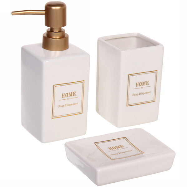 Каждый элемент набора выполнен из высококачественной керамики, что гарантирует его долговечность. Белый цвет с золотыми элементами делает набор универсальным и легко сочетаемым с другими аксессуарами. Размеры предметов не указаны, но их форма и стиль позволяют удобно разместить их на любой поверхности.