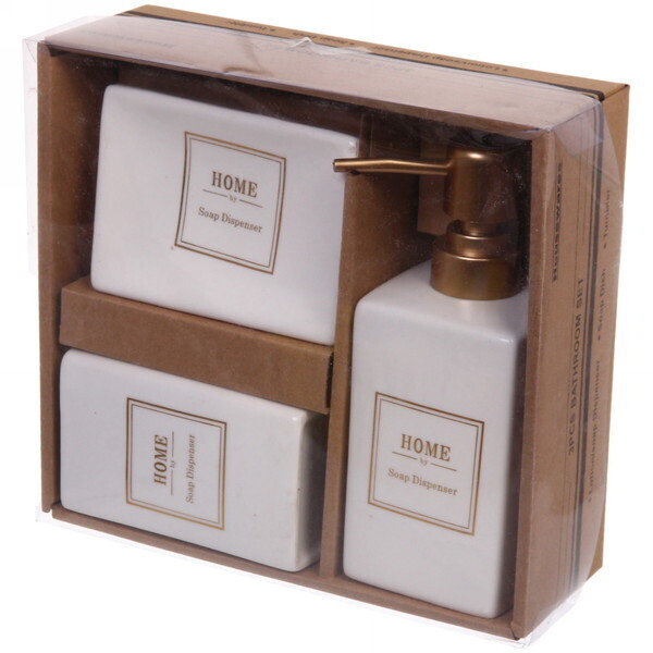 В набор входят дозатор для мыла, стакан для зубных щеток и мыльница. Каждый предмет выполнен в минималистичном стиле, что делает их идеальными для любого дизайна ванной комнаты. Дозатор с золотистой крышкой и насосом позволяет легко извлекать мыло, а стакан удобно хранит зубные щетки. Мыльница с овальной формой идеально подходит для размещения мыла, обеспечивая его доступность и аккуратный вид.