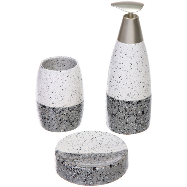 Цветовая гамма набора включает серый, белый и черный цвета, что позволяет ему вписаться в любой интерьер. Каждый элемент набора имеет гладкую поверхность, что делает его не только красивым, но и удобным в использовании. Размеры предметов стандартные, что позволяет разместить их в любом удобном месте вашей ванной комнаты.