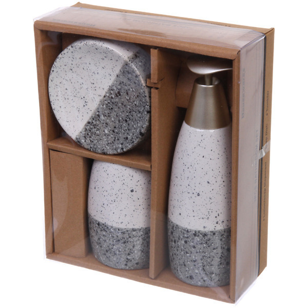 Набор включает в себя дозатор для жидкого мыла, стаканчик и подставку. Каждый элемент выполнен в минималистичном дизайне, что делает его идеальным для современных интерьеров. Дозатор имеет вытянутую форму с металлической верхней частью, а стаканчик и подставка выполнены в гармоничных цветах, что позволяет легко сочетать их с другими предметами ванной комнаты.