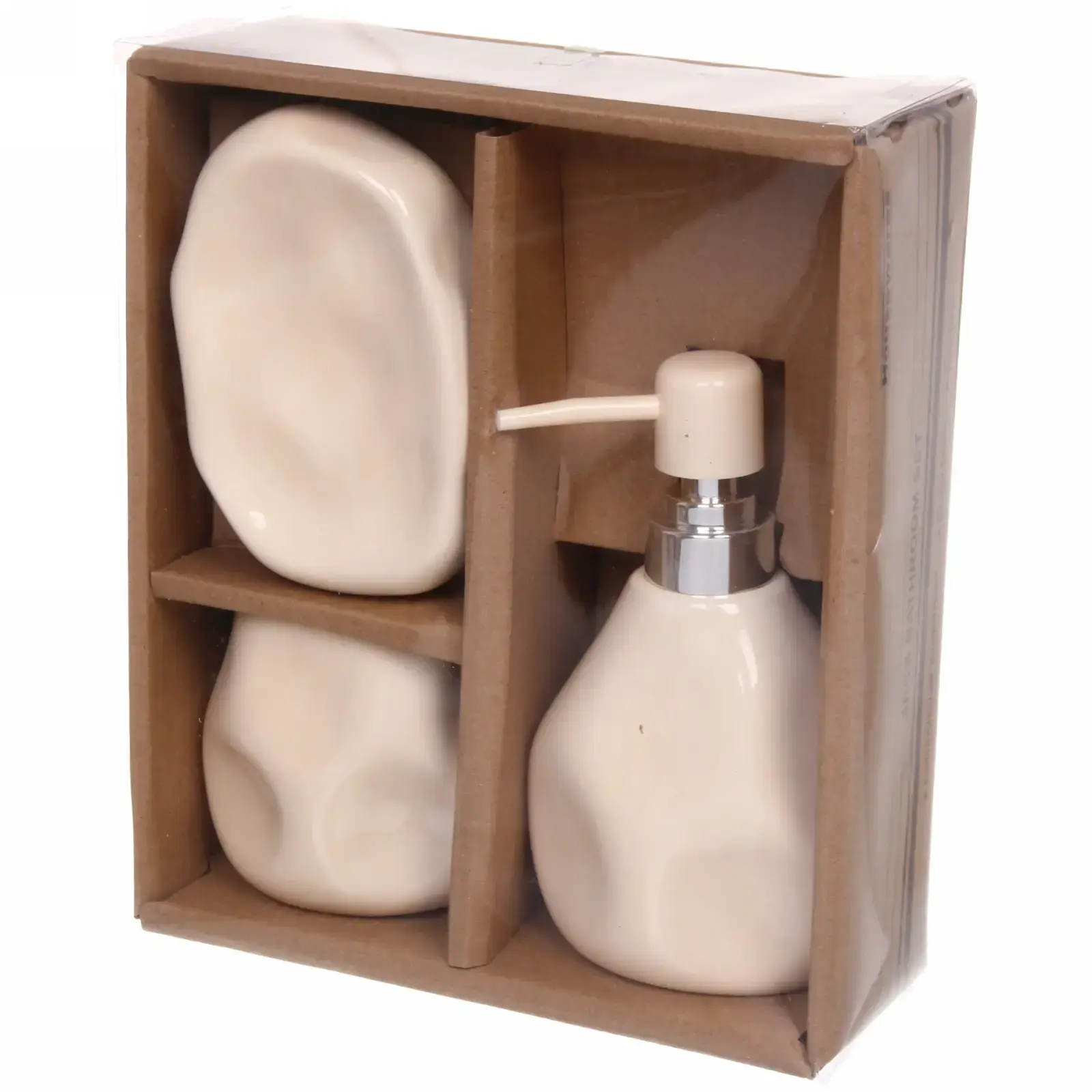 Набор из трёх керамических аксессуаров создаст атмосферу уюта и продуманного дизайна в вашем санузле. Практичные предметы с мягкими линиями и нейтральной палитрой легко впишутся в любой интерьер, делая ежедневные ритуалы приятнее.